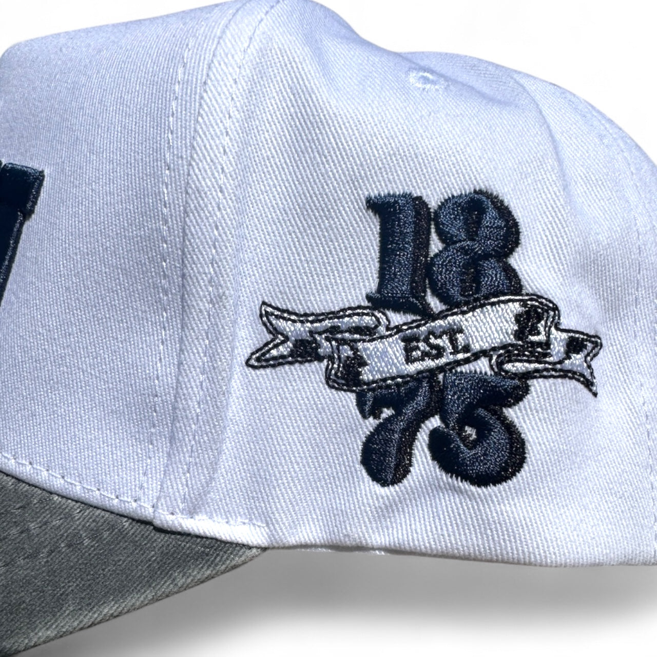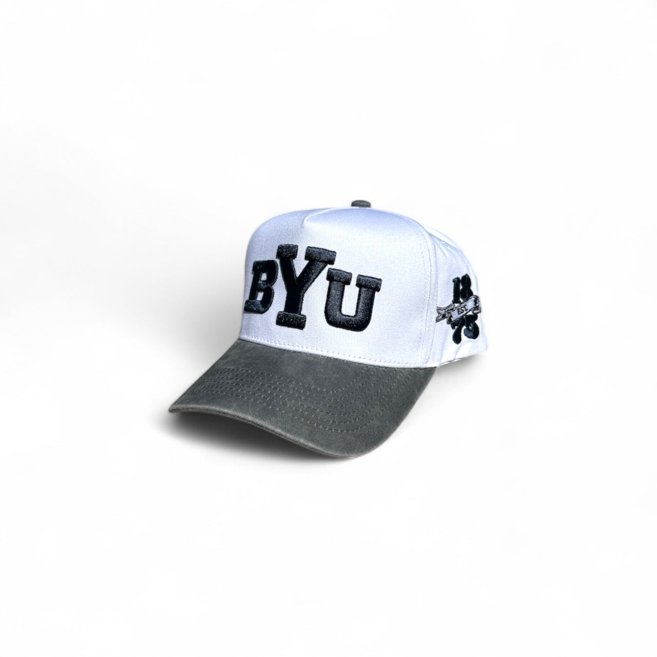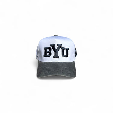 This 5-panel structured hat features a clean white crown paired with a subtly faded gray brim. The front showcases a navy BYU logo, complemented by a navy 1875 emblem on the side.