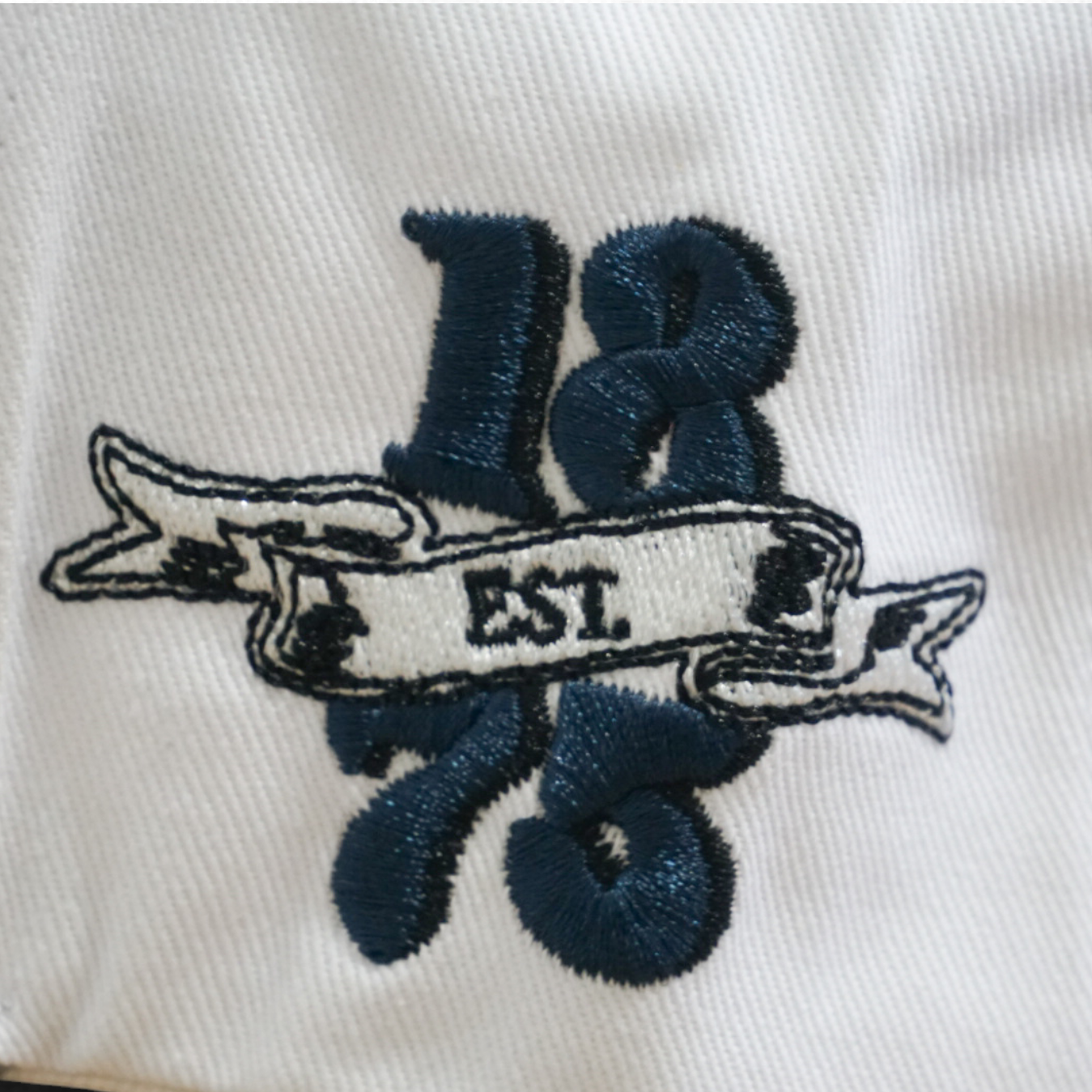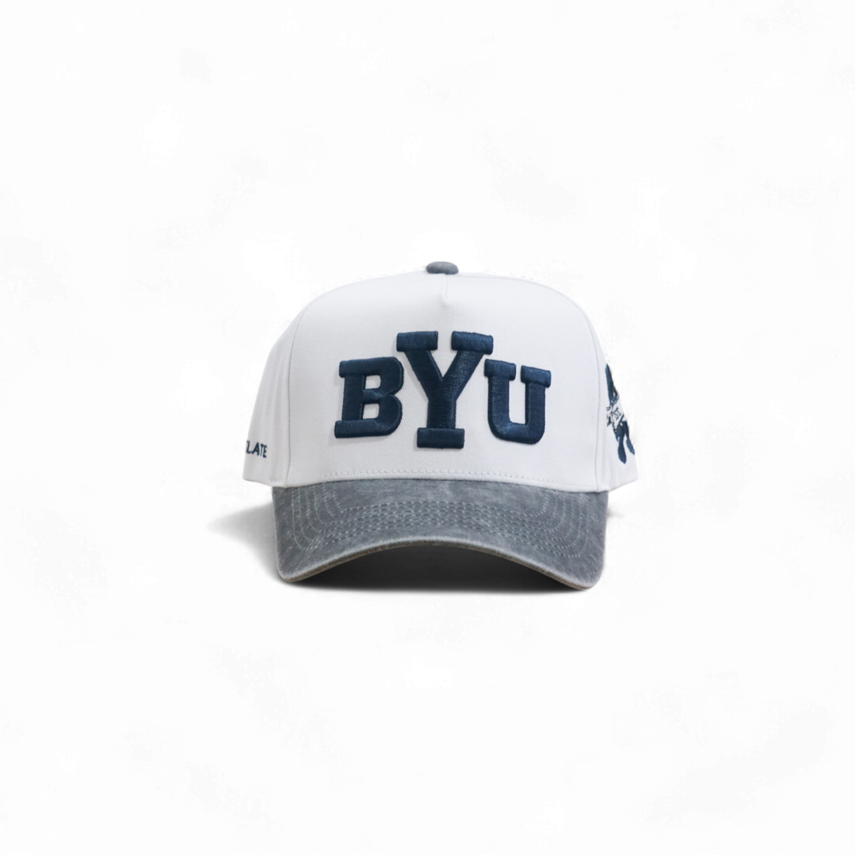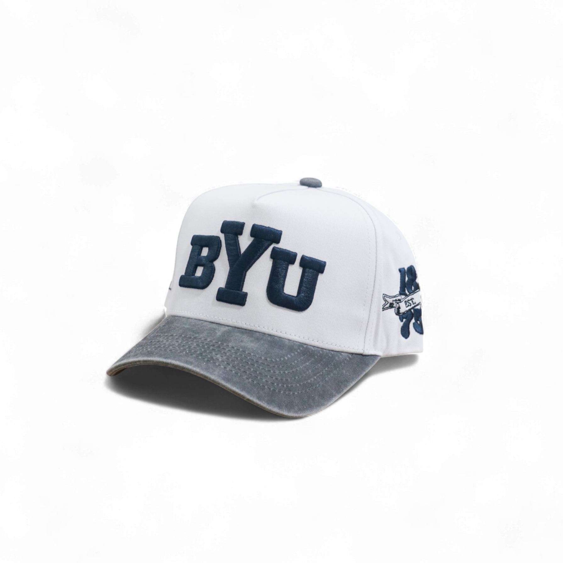 This 5-panel structured hat features a clean white crown paired with a subtly faded gray brim. The front showcases a navy BYU logo, complemented by a navy 1875 emblem on the side.
