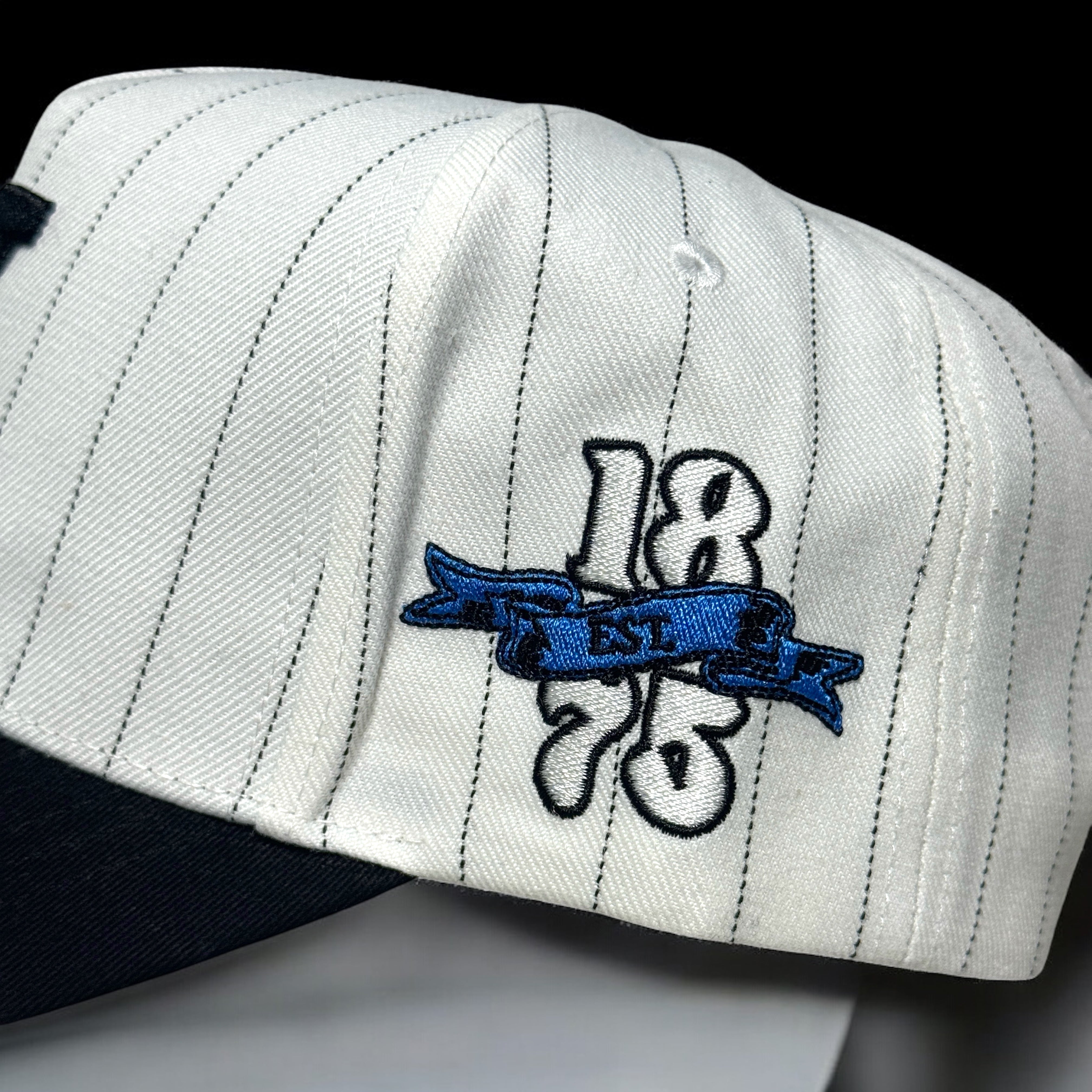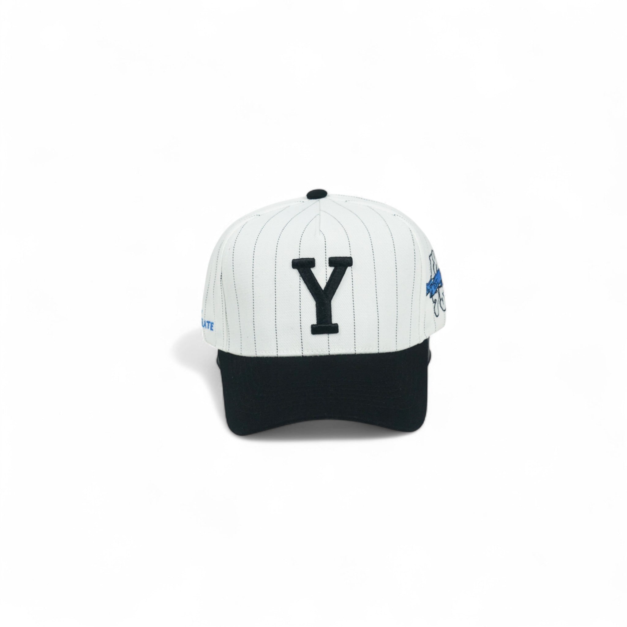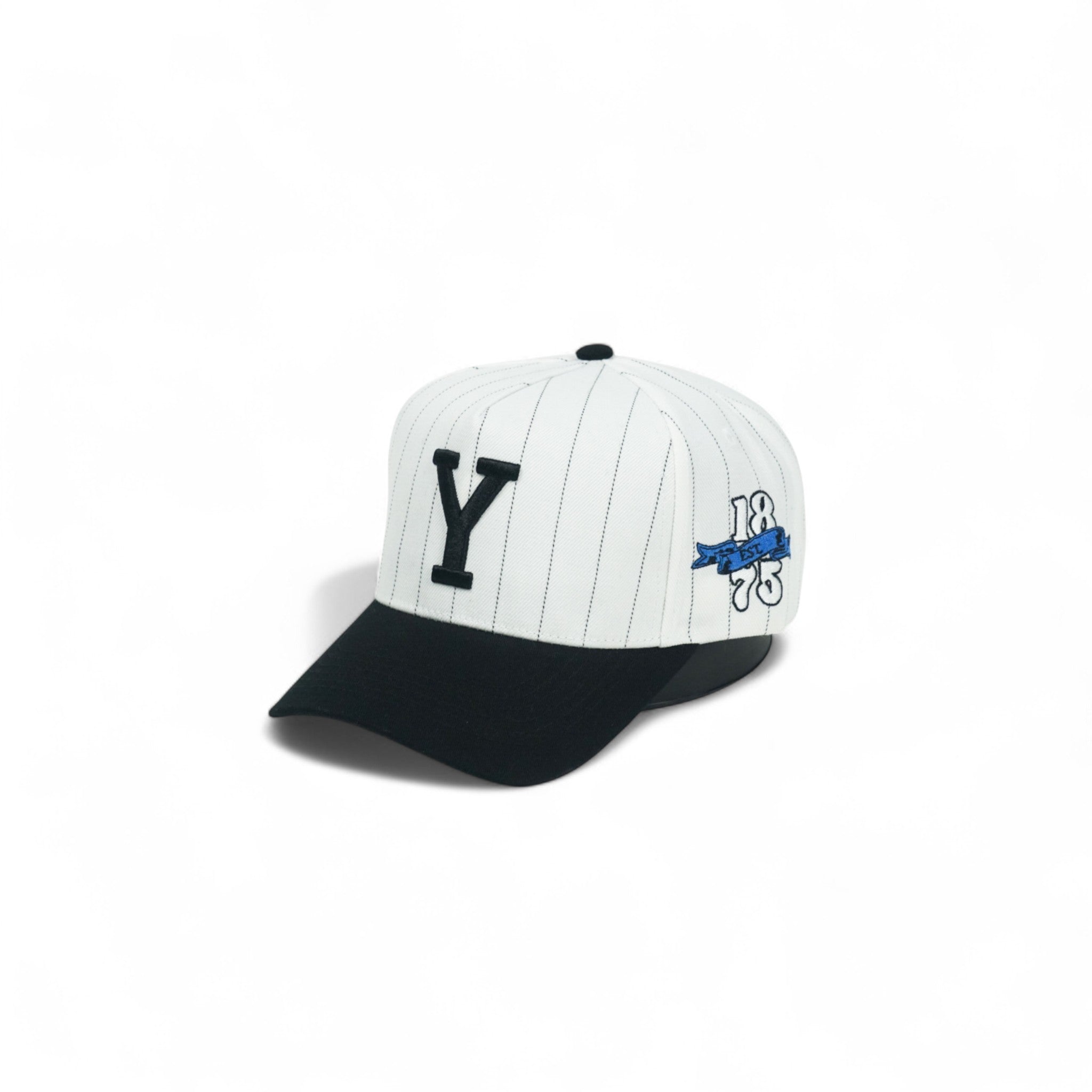 This 5-panel structured hat features a crisp white crown with black pinstripes, anchored by a bold embroidered Y front logo. The black brim adds contrast and edge, while the 1875 side logo nods to timeless tradition. With its clean lines and premium structure, this piece blends old-school heritage with modern streetwear energy.