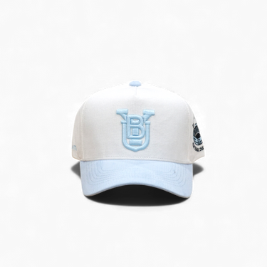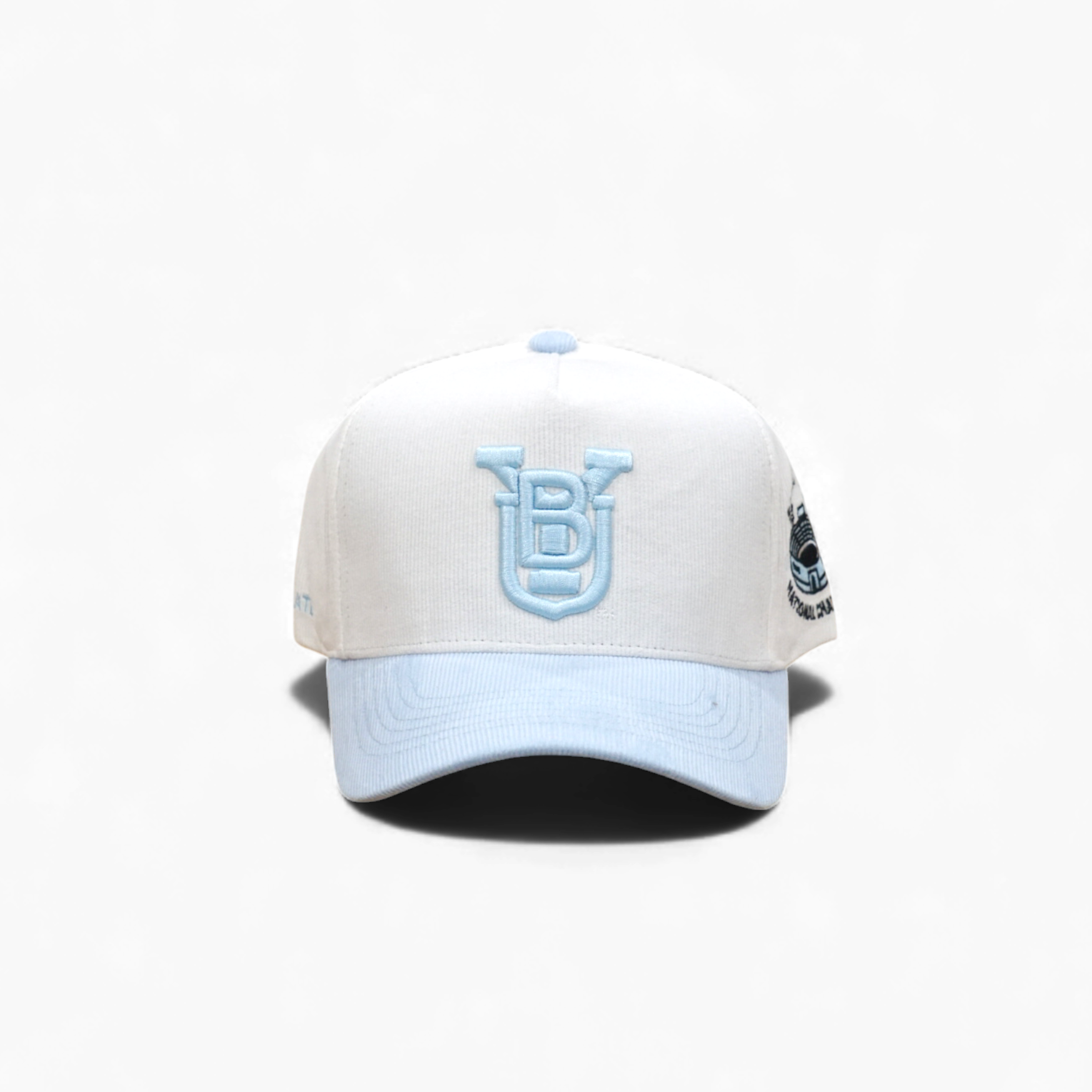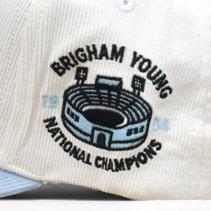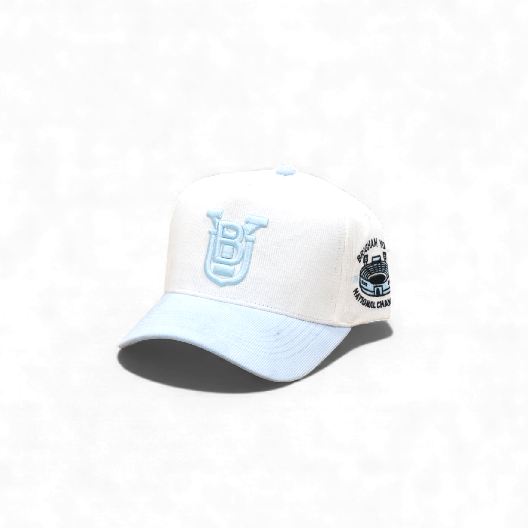 Five-panel snapback built with structured deep fit and full corduroy fabric. White crown with baby blue brim and gray suede underbrim. Stacked BYU logo on front, National Champions emblem on side. Snapback closure for adjustable wear.