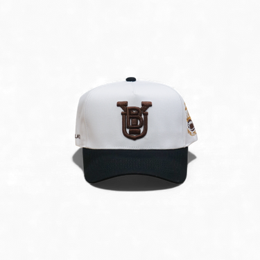 Classic snapback with structured 5-panel construction and deep fit. Features BYU stacked logo in brown on white crown, black brim, and gray suede underbrim. National Champions side patch adds authentic team pride. Timeless design for everyday wear.