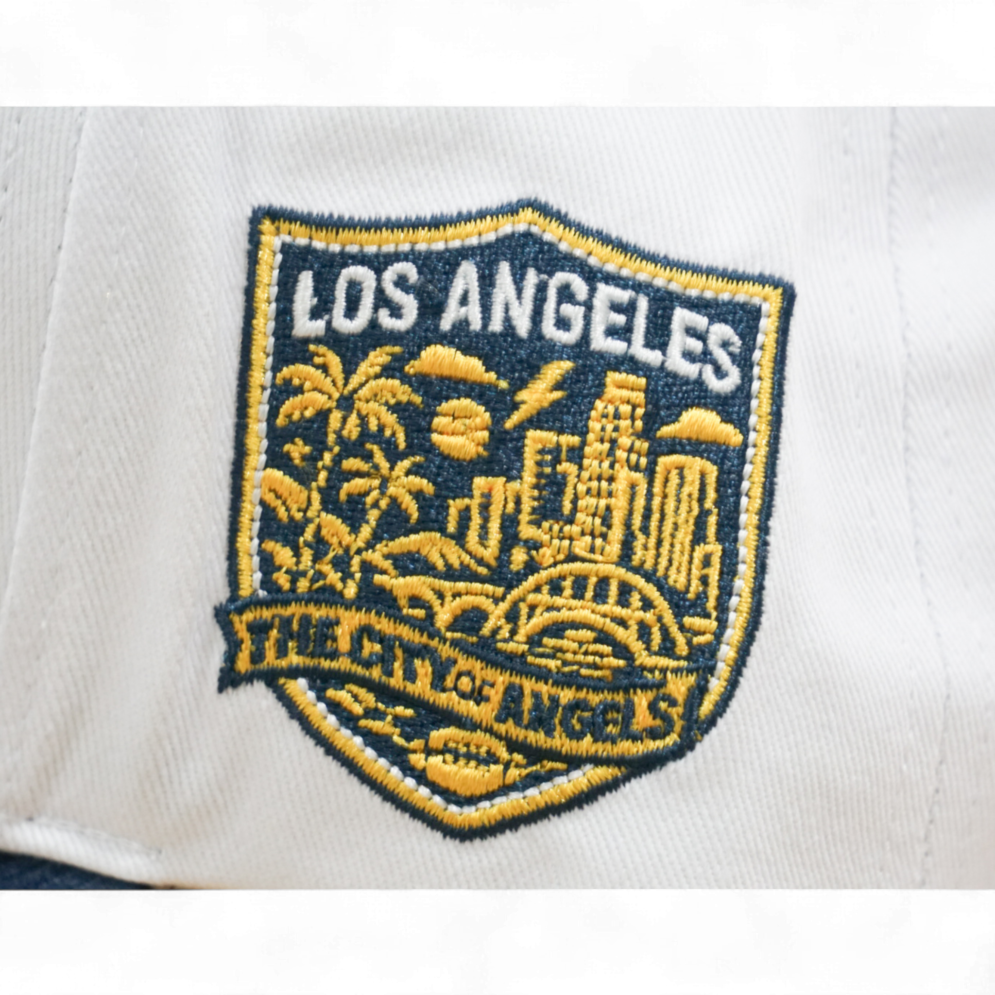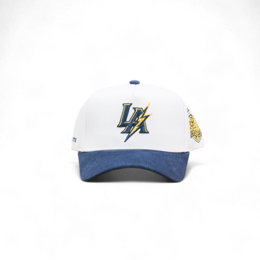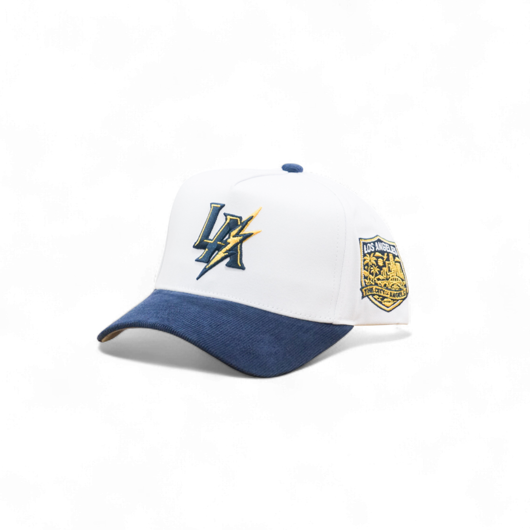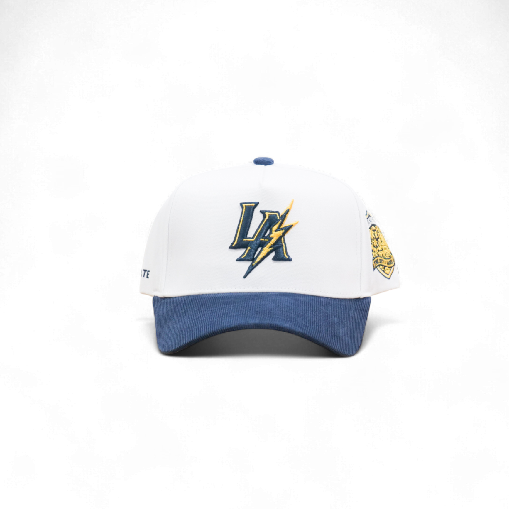 Classic 5-panel snapback with structured deep fit. Features LA Lightning embroidered front logo and City of Angels side patch. White cotton crown pairs with contrasting blue corduroy brim for understated style. Adjustable snap closure for a personalized fit.