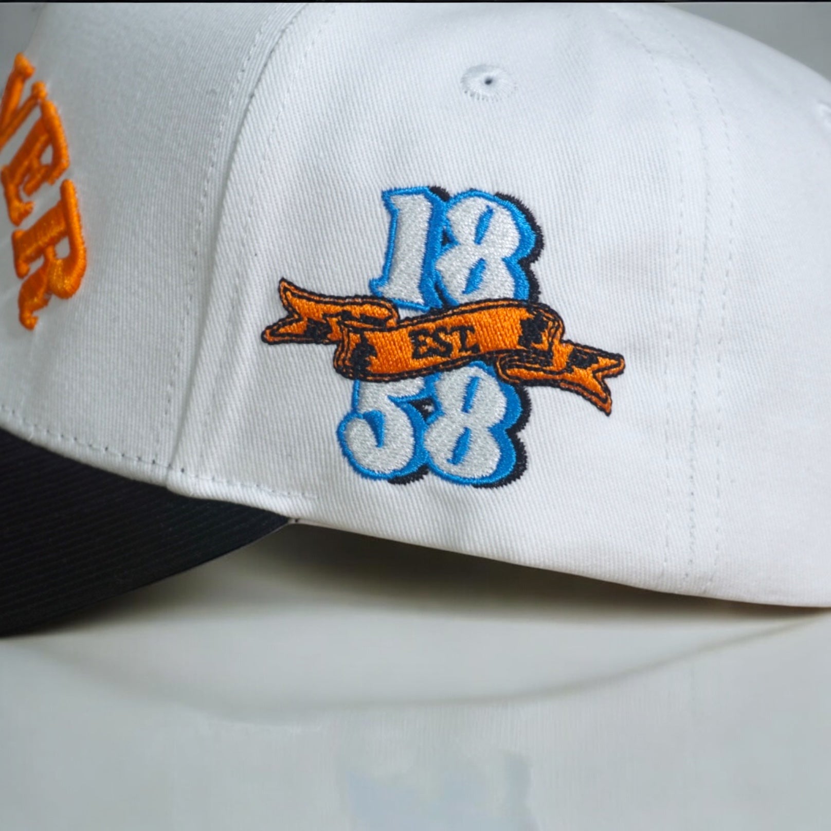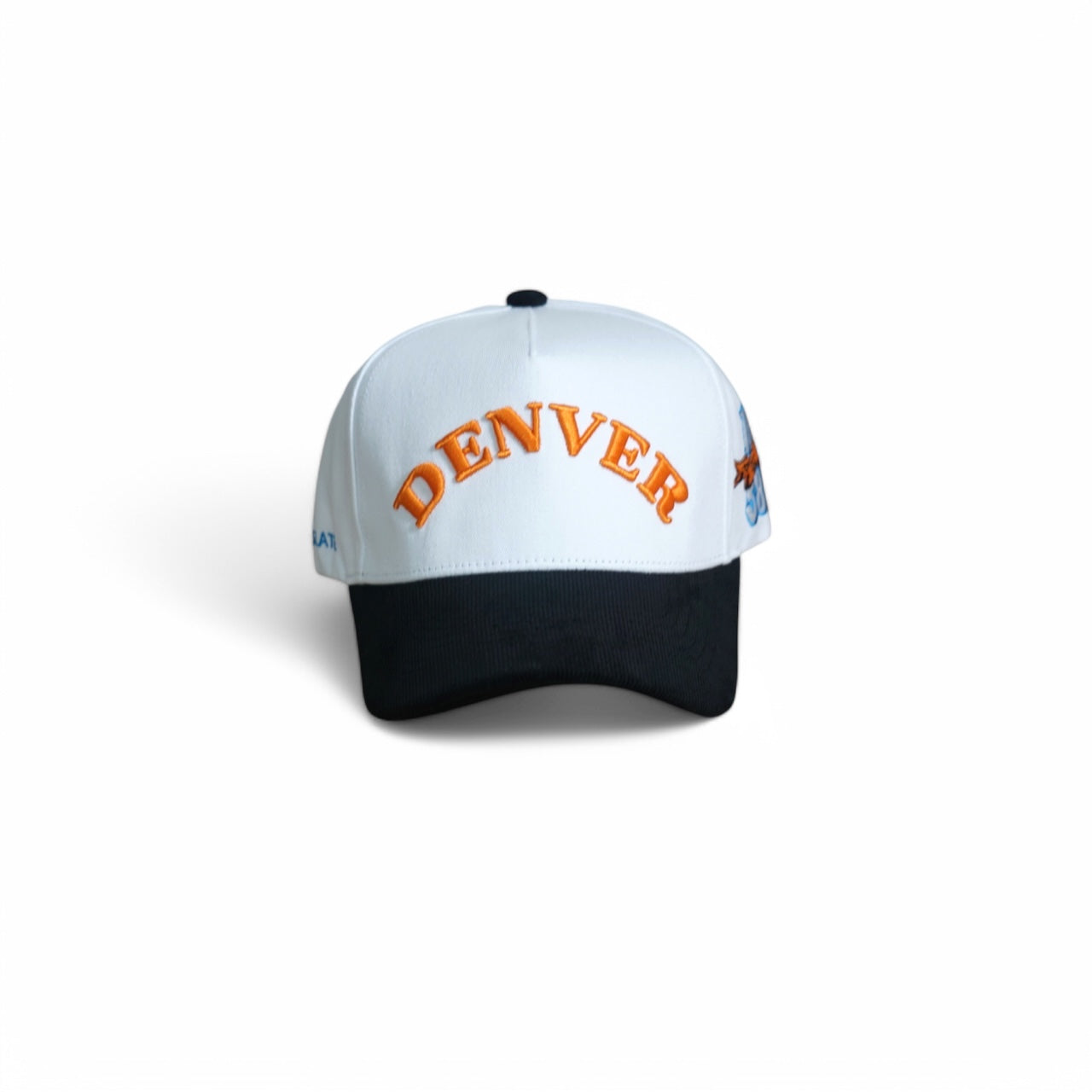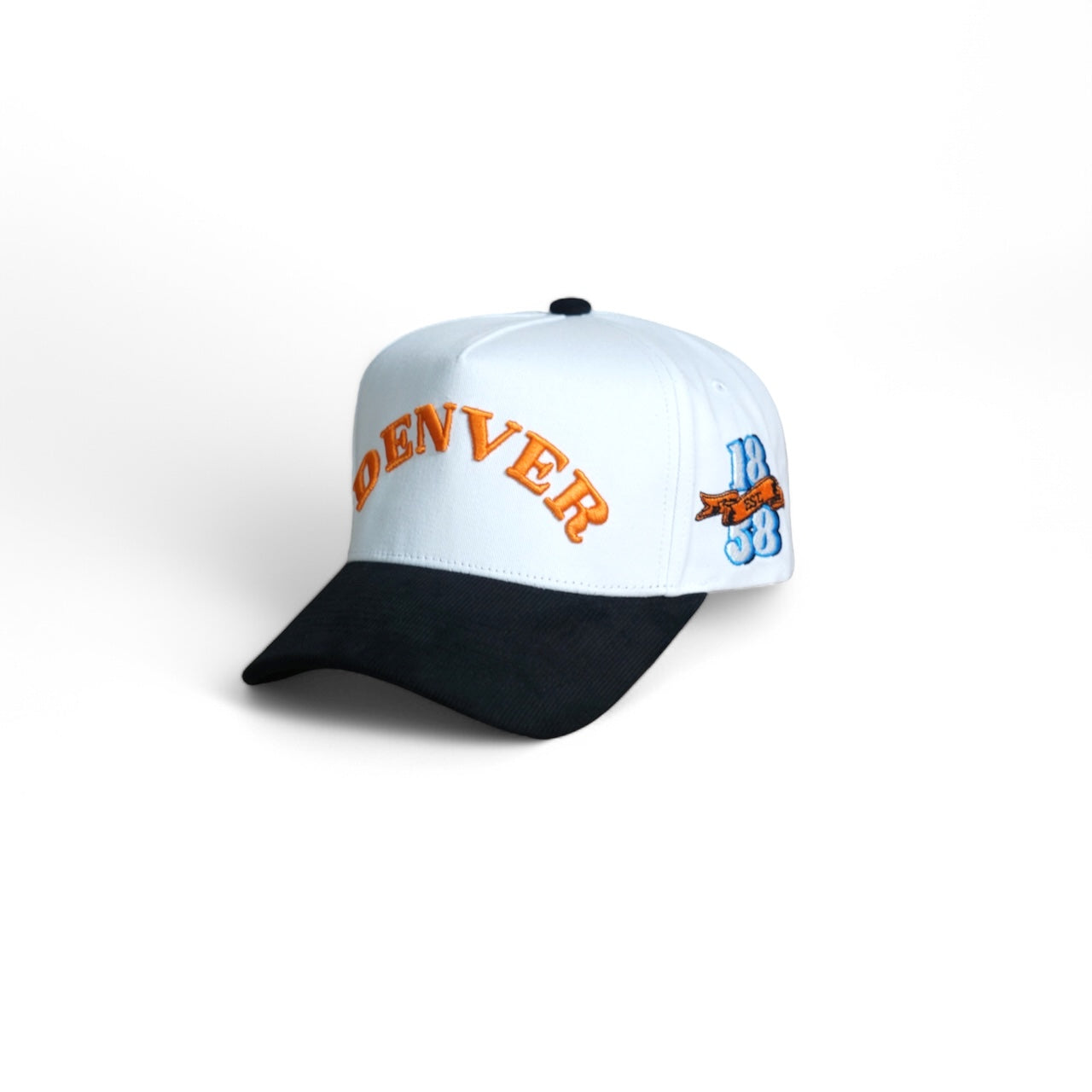 Denver corduroy is a durable 5 panel hat featuring a black corduroy brim and a white crown with the iconic "Denver" logo on the front. The side logo displays "est 1858", representing the rich history of the city.