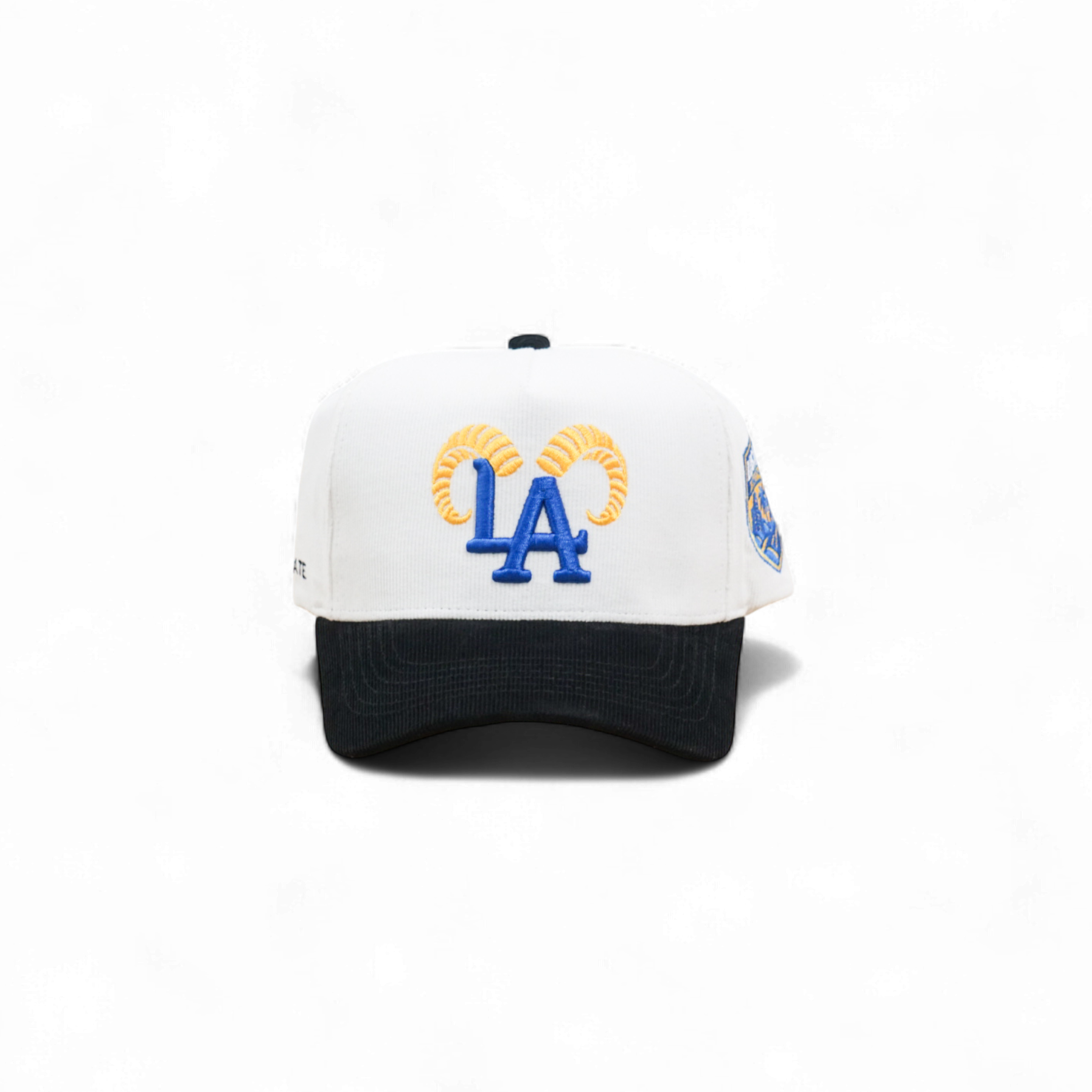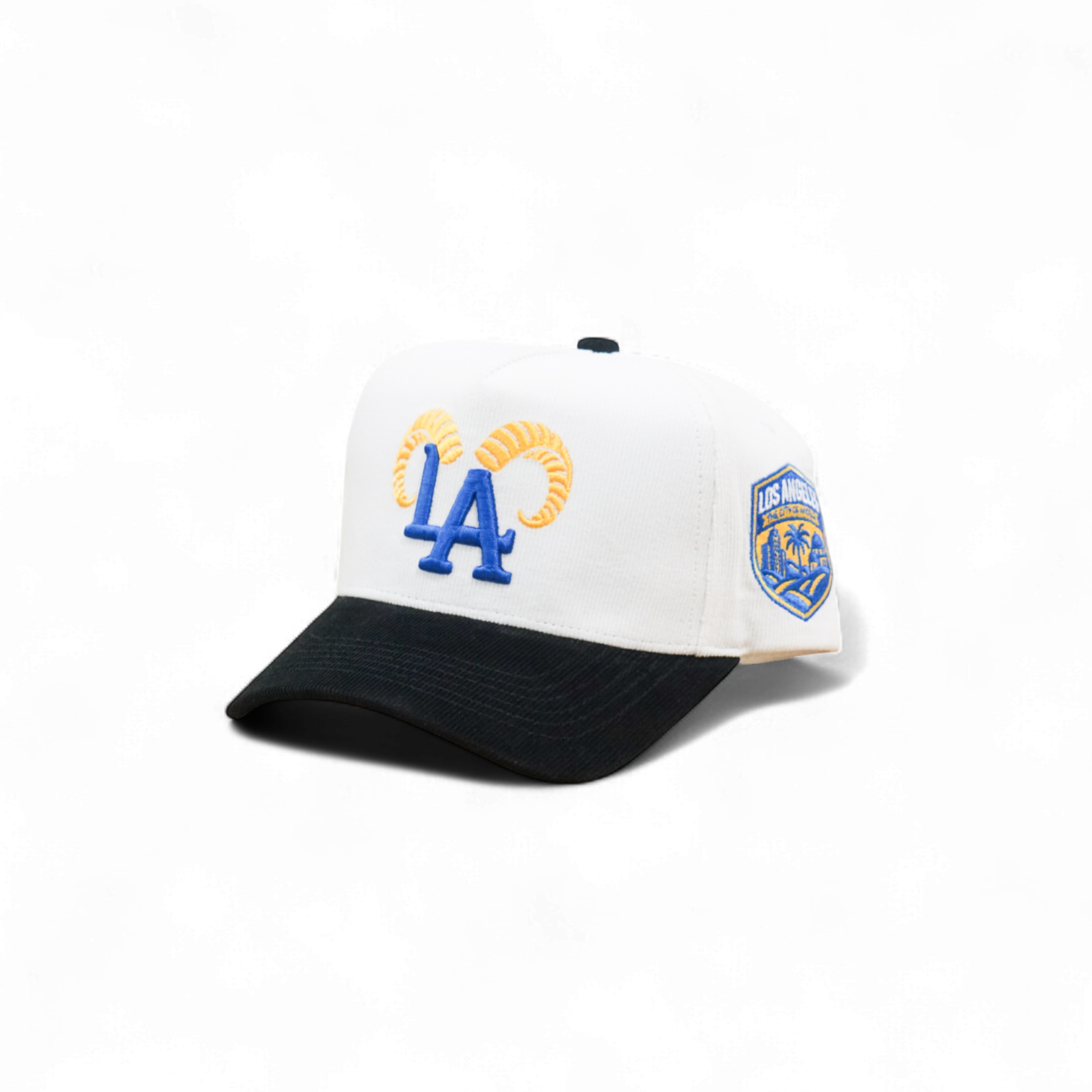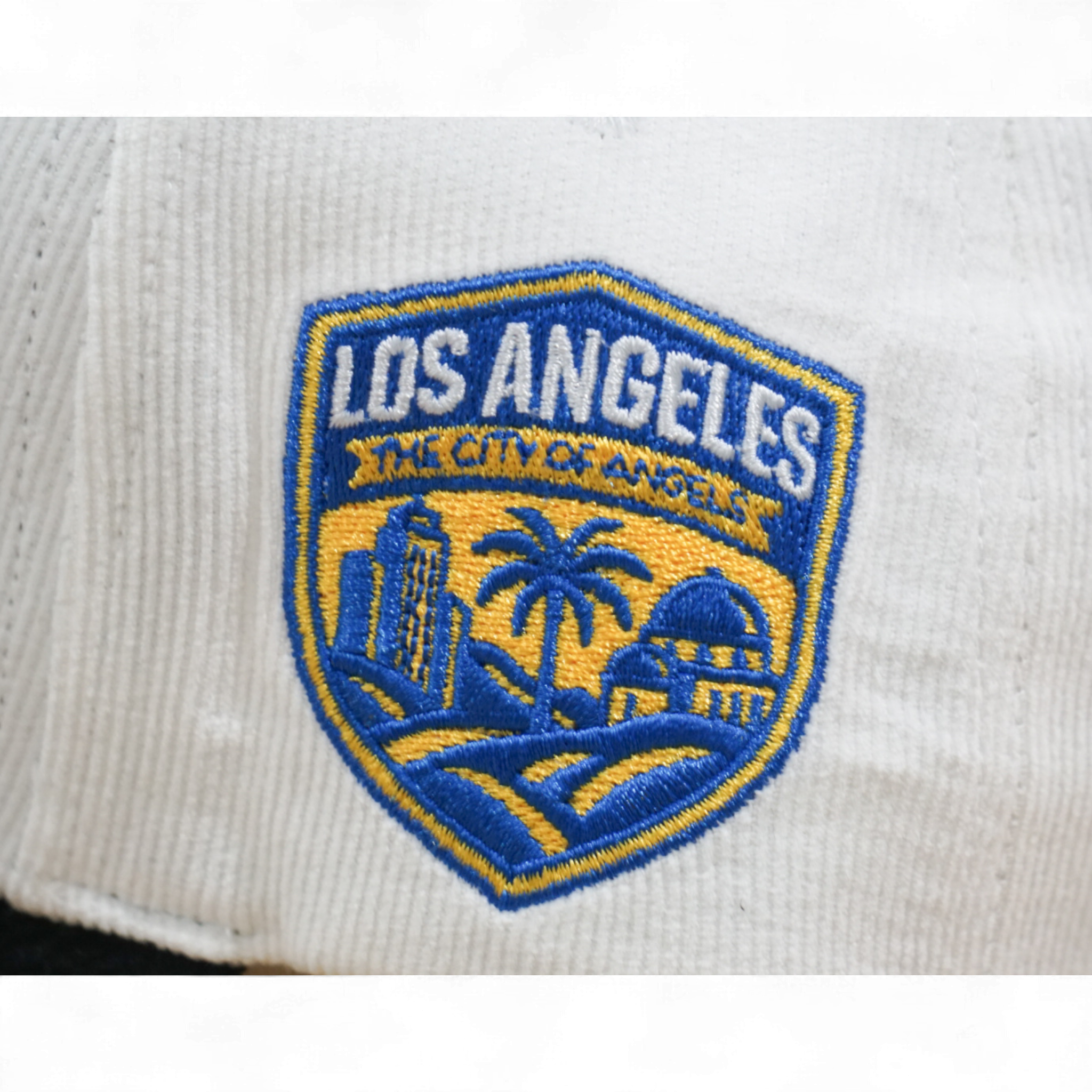 Classic 5-panel snapback with structured deep fit and crisp corduroy construction. White crown pairs with black brim for clean contrast. Features embroidered horned LA logo on front and Los Angeles side branding. Adjustable snap closure for comfortable all-day wear.