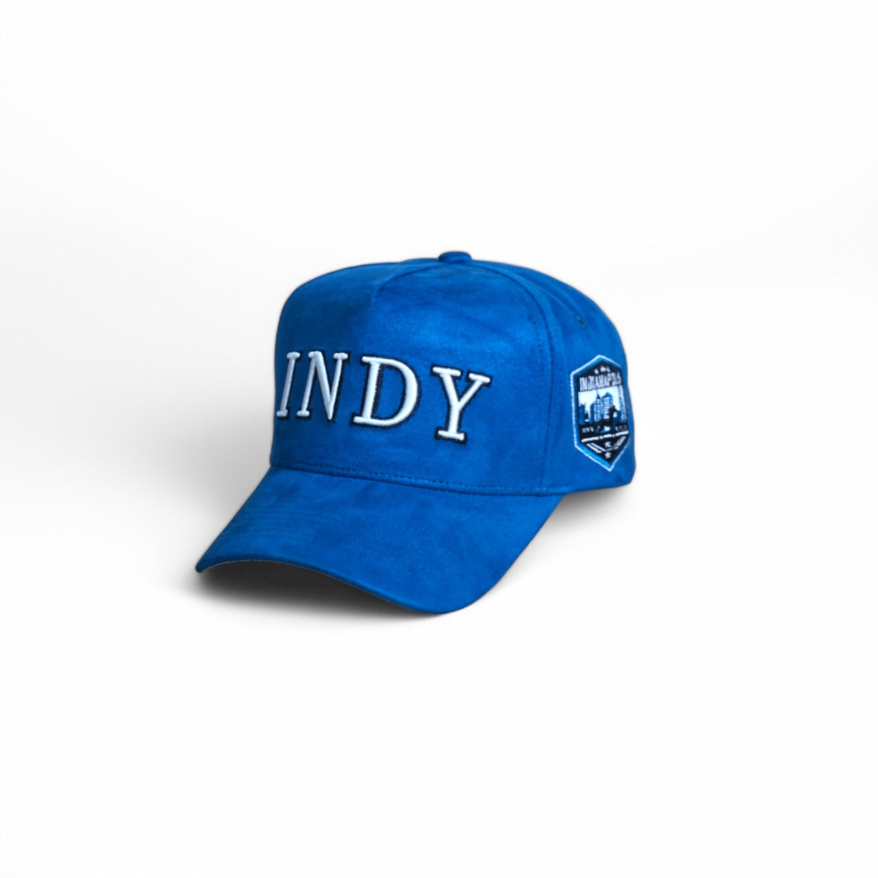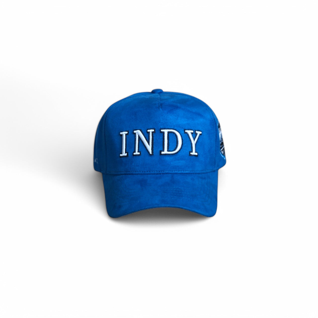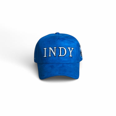 Experience comfort and style with the INDY Suede structured 5 panel hat. Featuring a high-quality blue suede exterior and a gray suede underbrim, this hat showcases the iconic INDY front logo and an Indianapolis side logo. Perfect for any fan or fashion-forward individual.