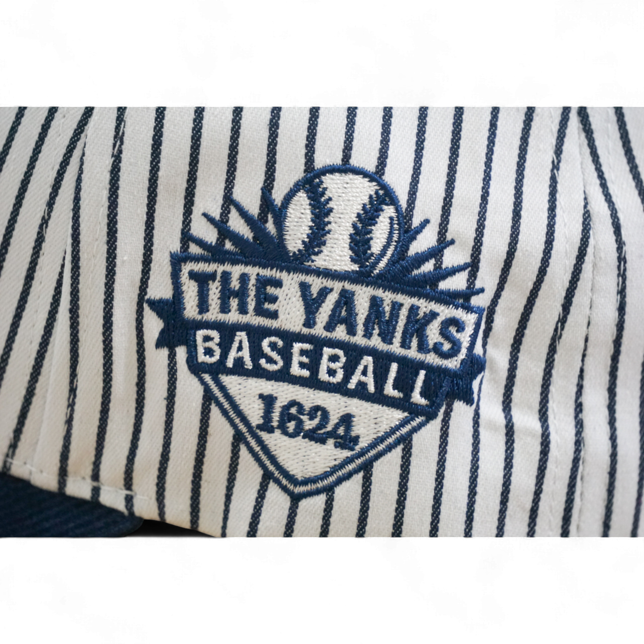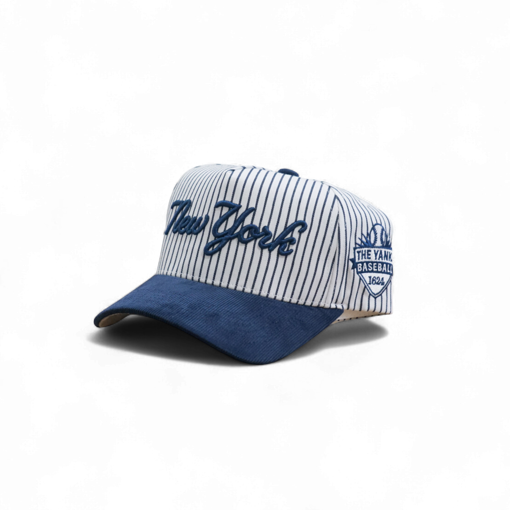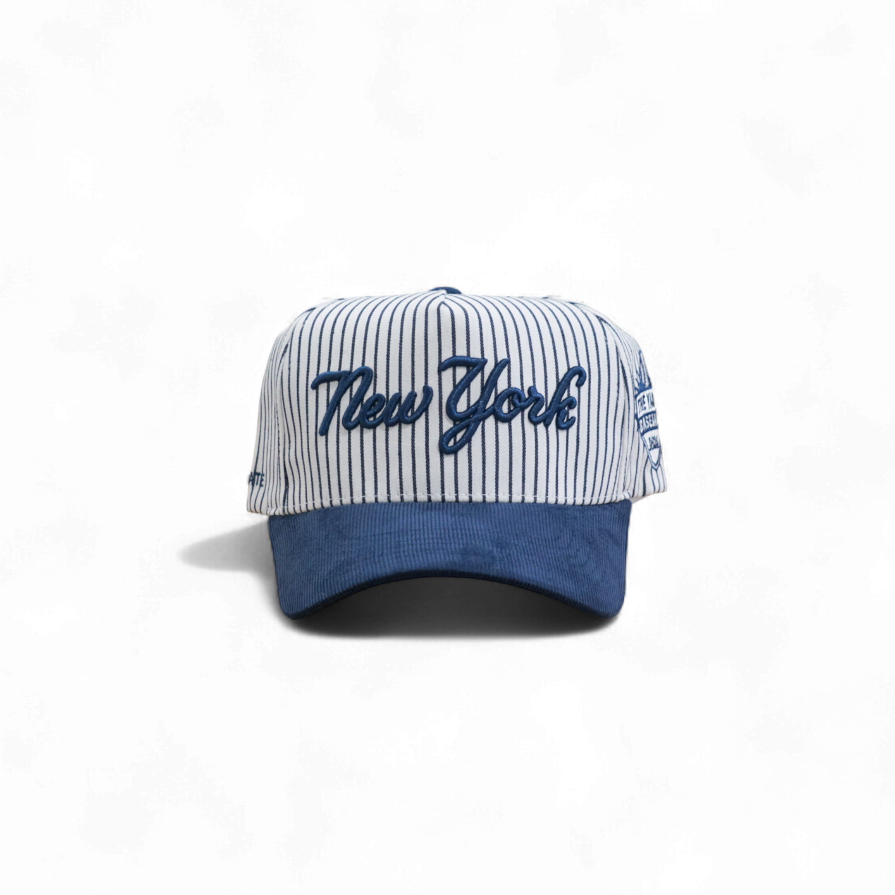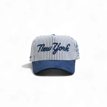 This 5-panel structured deep fit snapback combines a minimalist New York front logo with navy pinstripes. It features a navy corduroy brim, a gray suede underbrim, and a subtle baseball logo on the side for a refined, classic look.