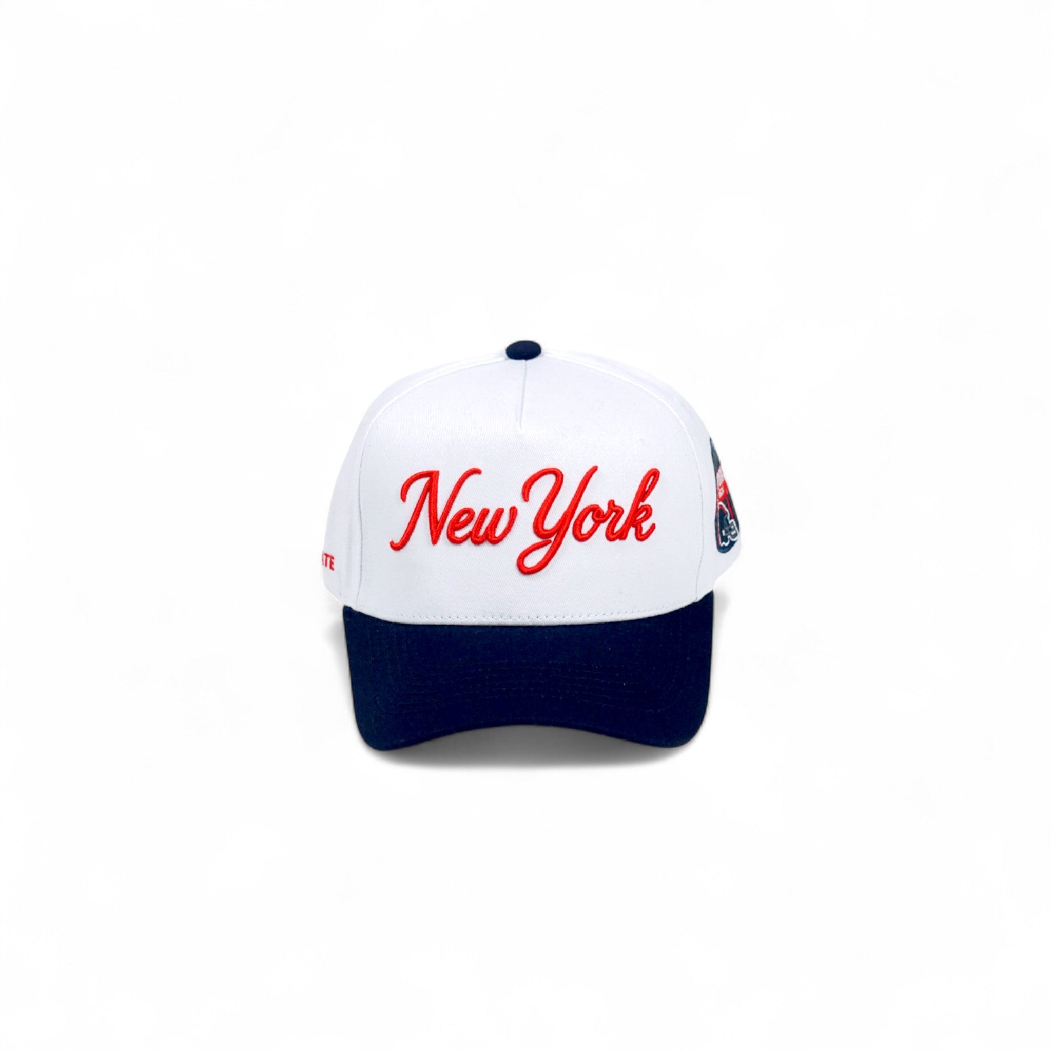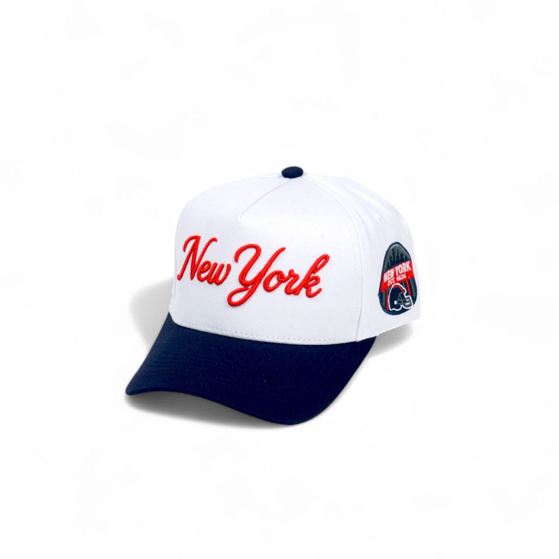 This structured 5-panel hat features a white crown and blue brim. It displays a New York logo on the front and a city emblem on the side, with a detailed skyline embroidered on the underbrim for a subtle, stylish touch.
