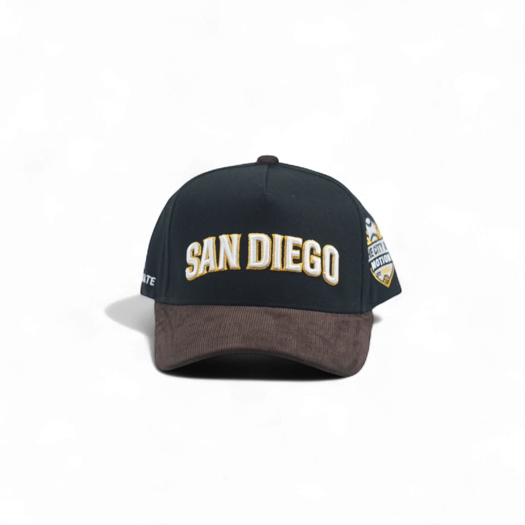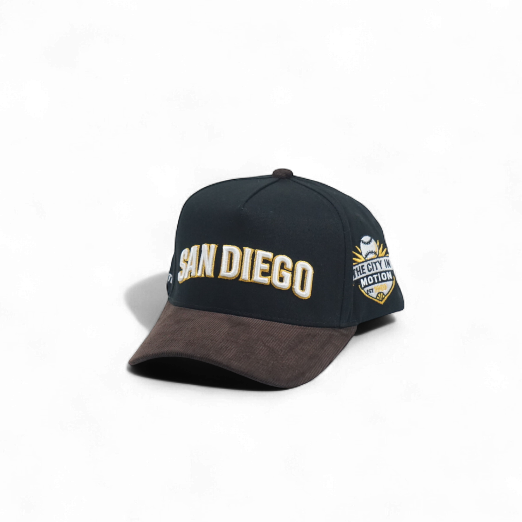 This 5-panel deep fit snapback features a black crown paired with a brown corduroy brim for a sleek, understated look. The front showcases a clean San Diego logo, while the side displays a subtle “The City in Motion” emblem, blending style with local pride. Designed for comfort and a perfect fit, it’s a refined choice for everyday wear.