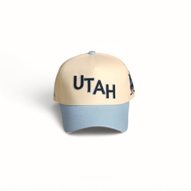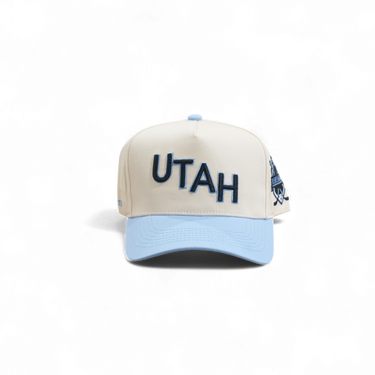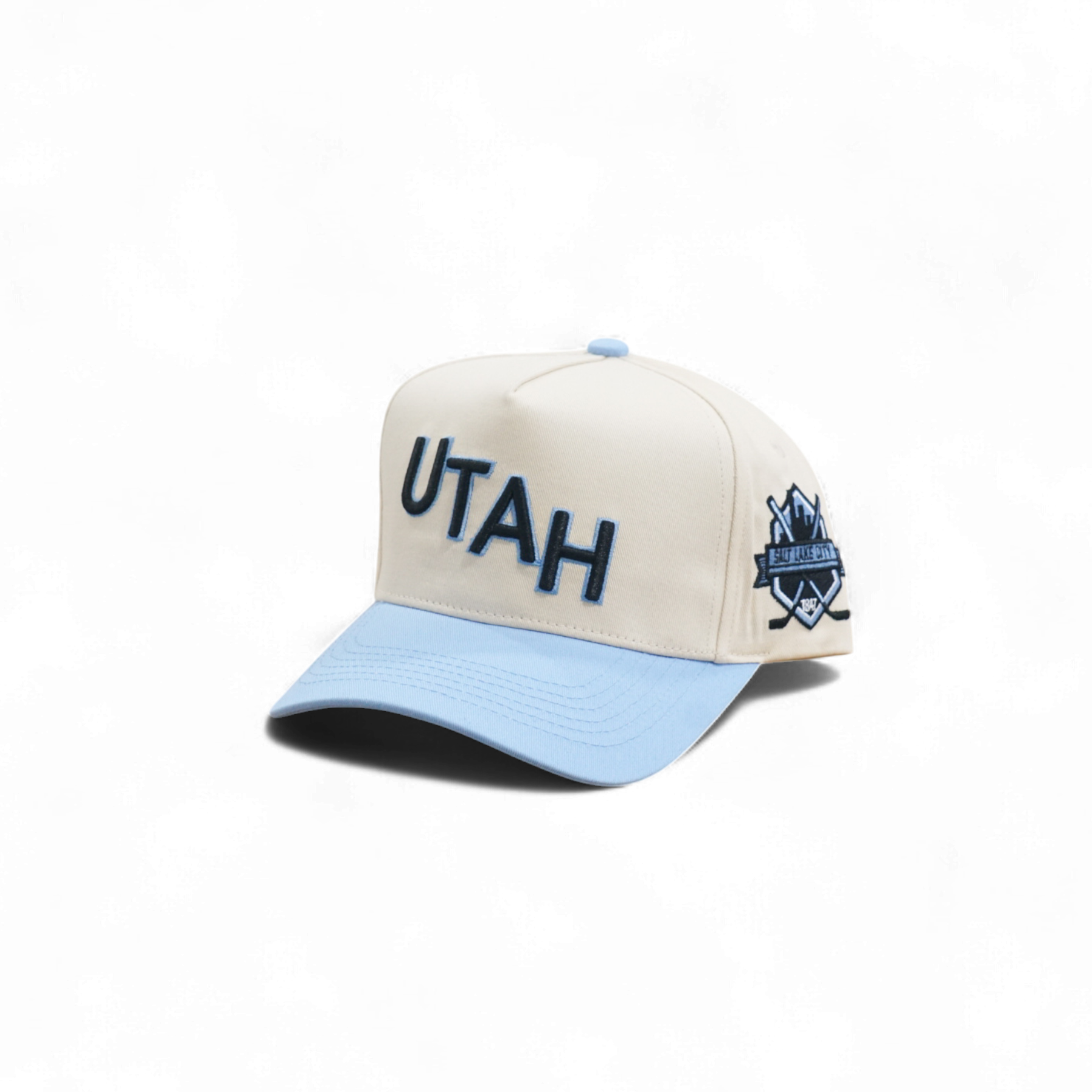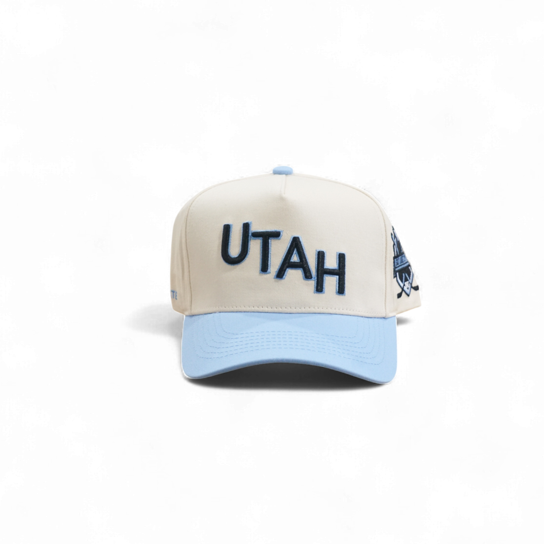 This Blue state of Utah product features a 5-panel structured hat with a blue brim and a "UTAH" logo on the front. The side logo showcases Salt Lake City and crossed hockey sticks for a touch of local sports flair.