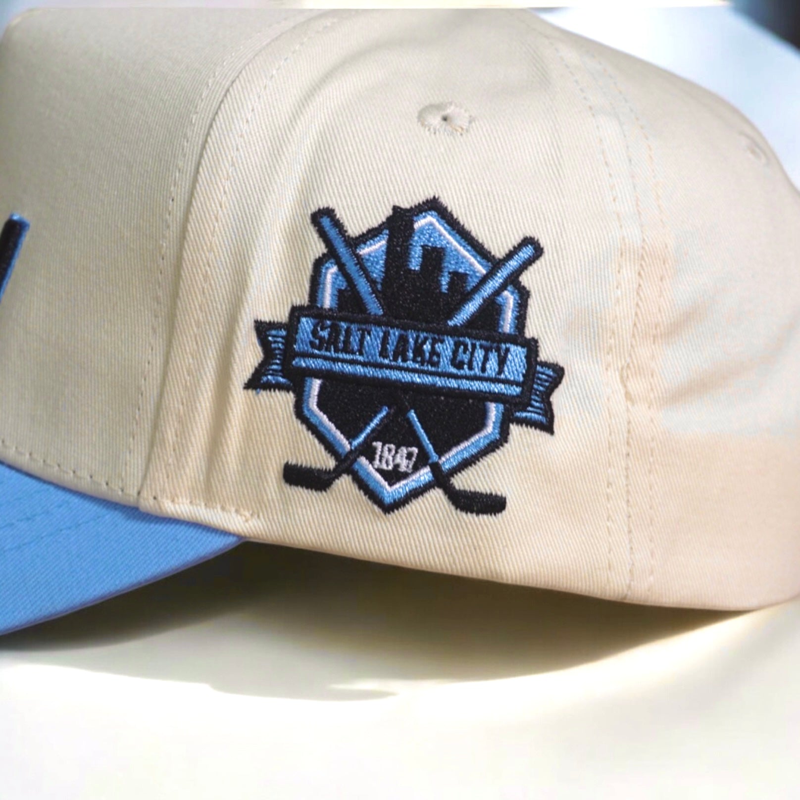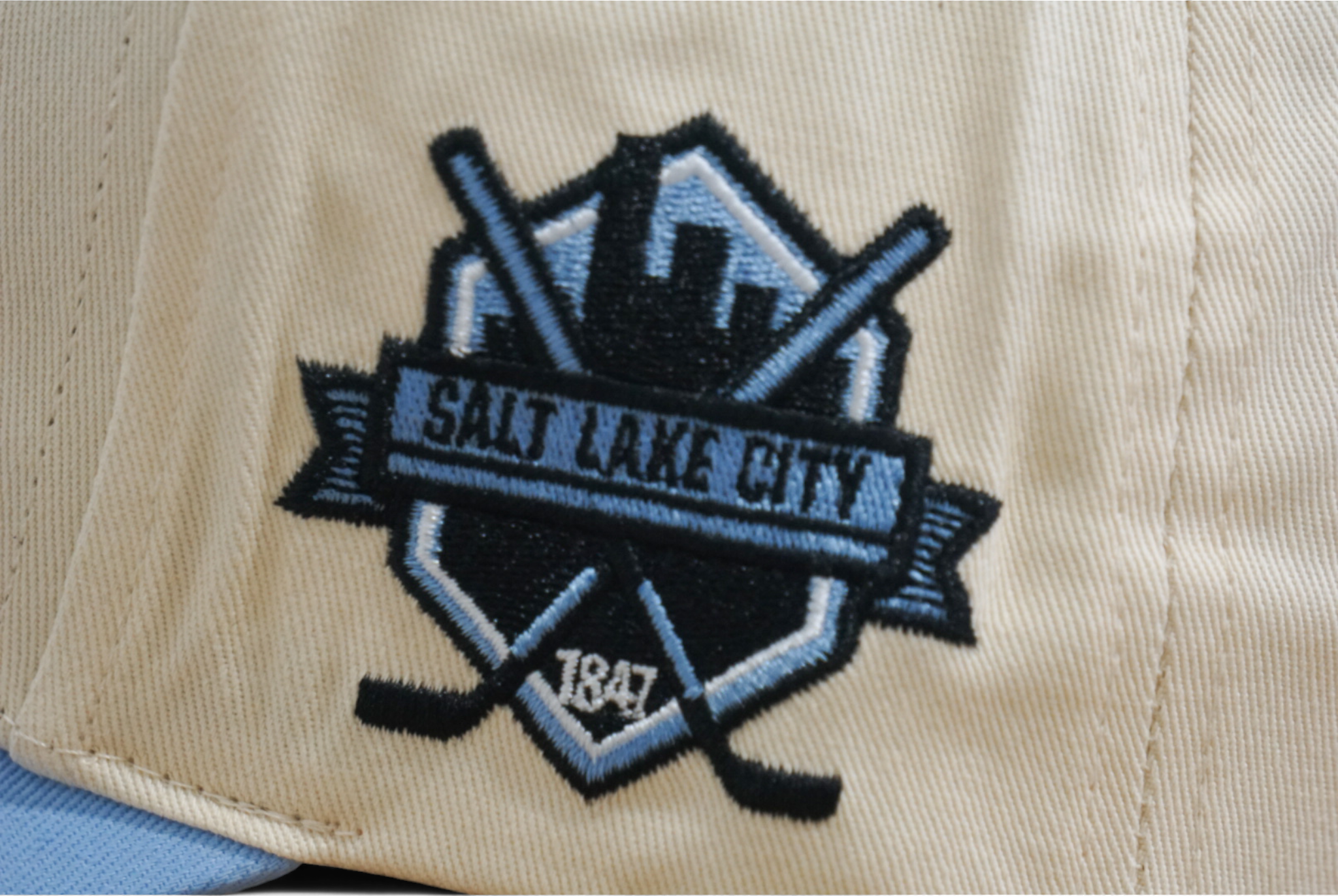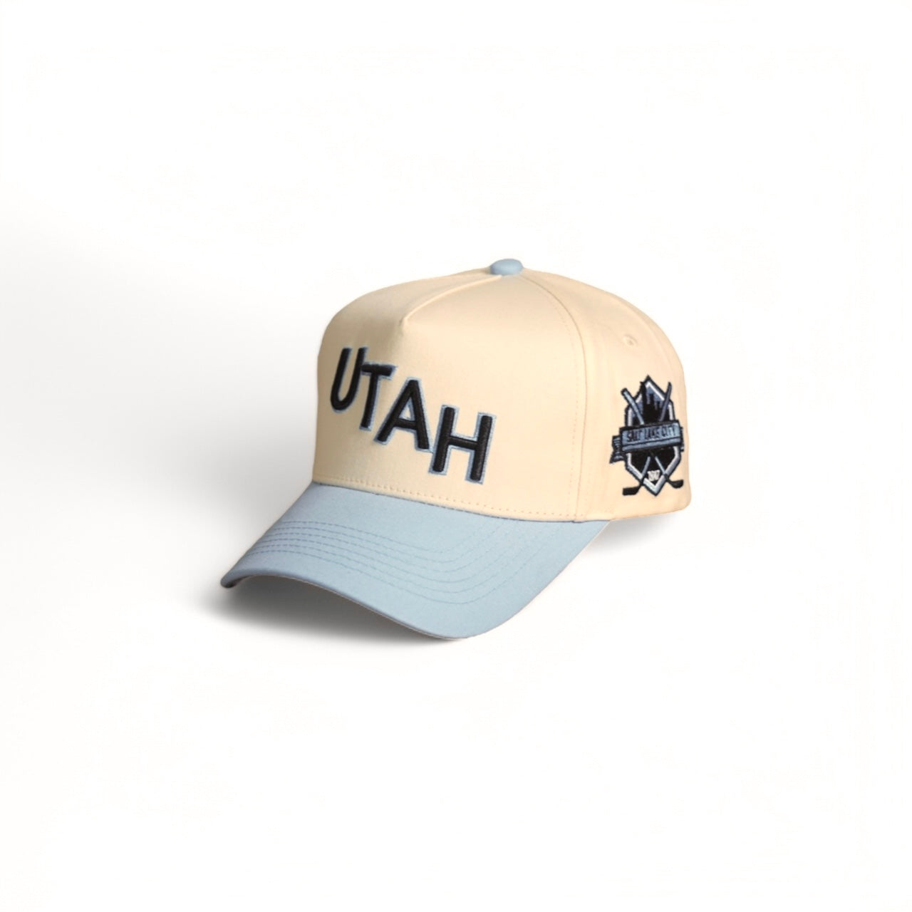 This Blue state of Utah product features a 5-panel structured hat with a blue brim and a "UTAH" logo on the front. The side logo showcases Salt Lake City and crossed hockey sticks for a touch of local sports flair.