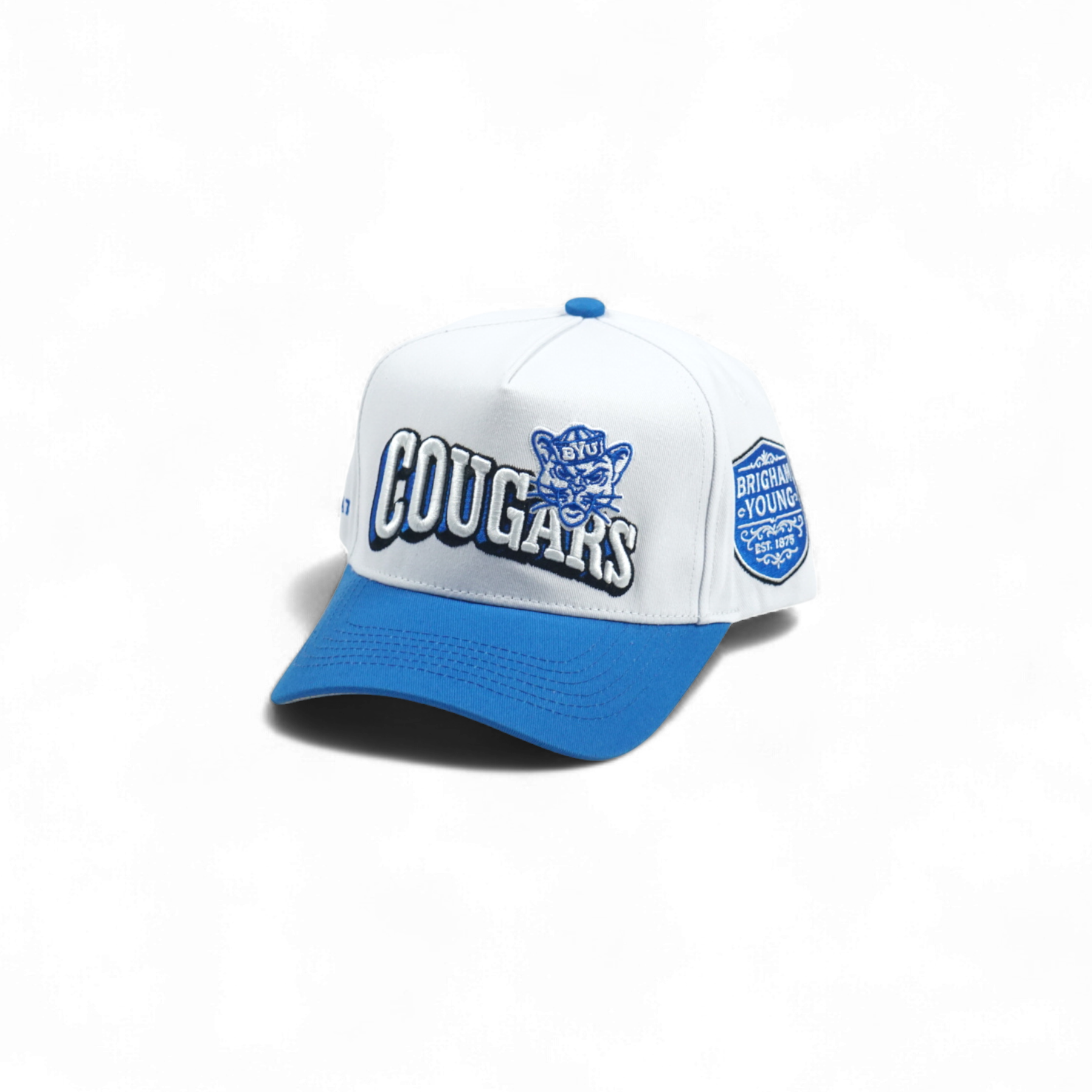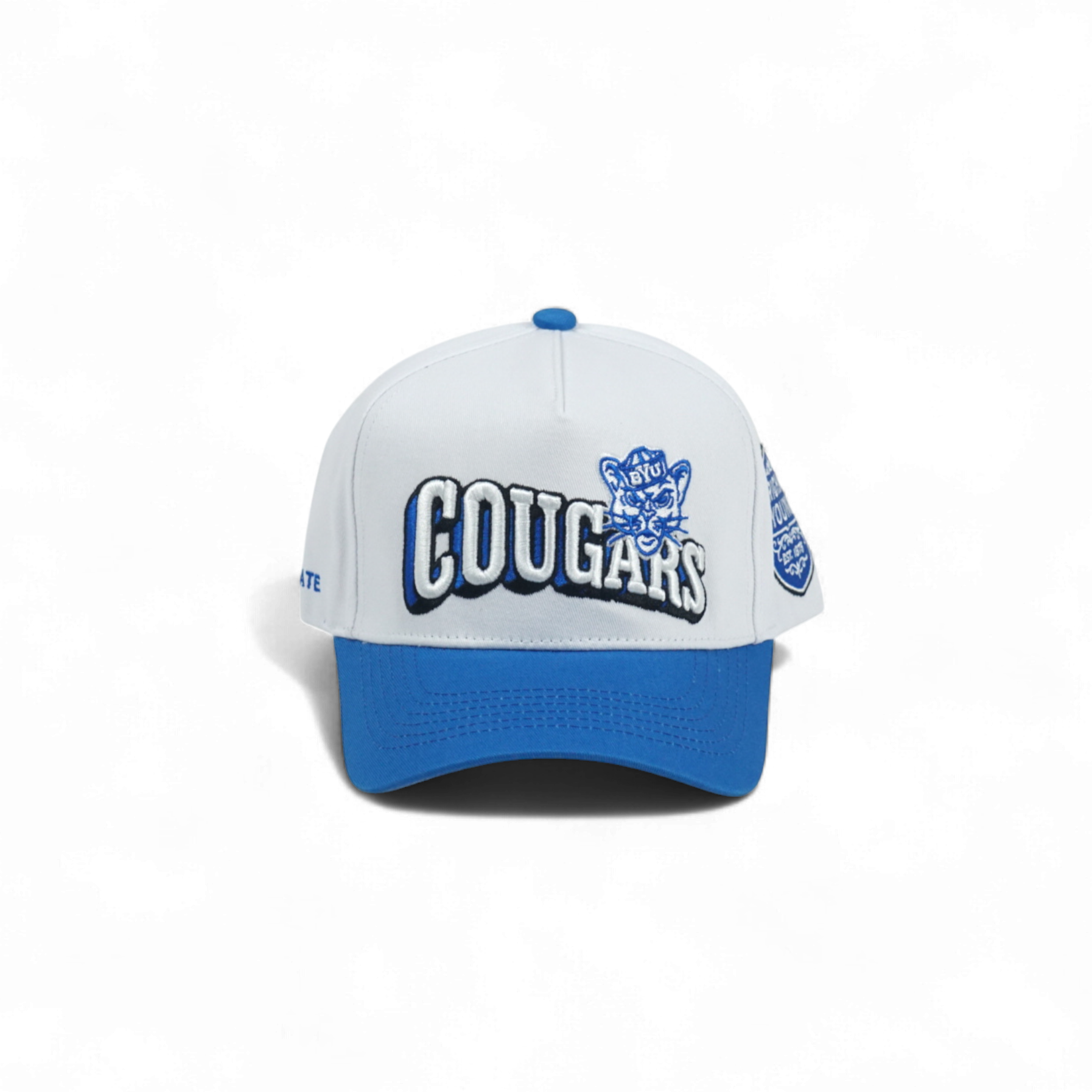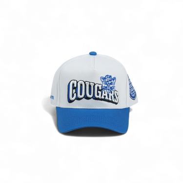 This 5-panel deep fit snapback features a clean white crown paired with a royal blue brim. It displays a bold Cougars logo on the front and a subtle vintage emblem on the side. The gray suede underbrim adds a refined touch to this classic design.
