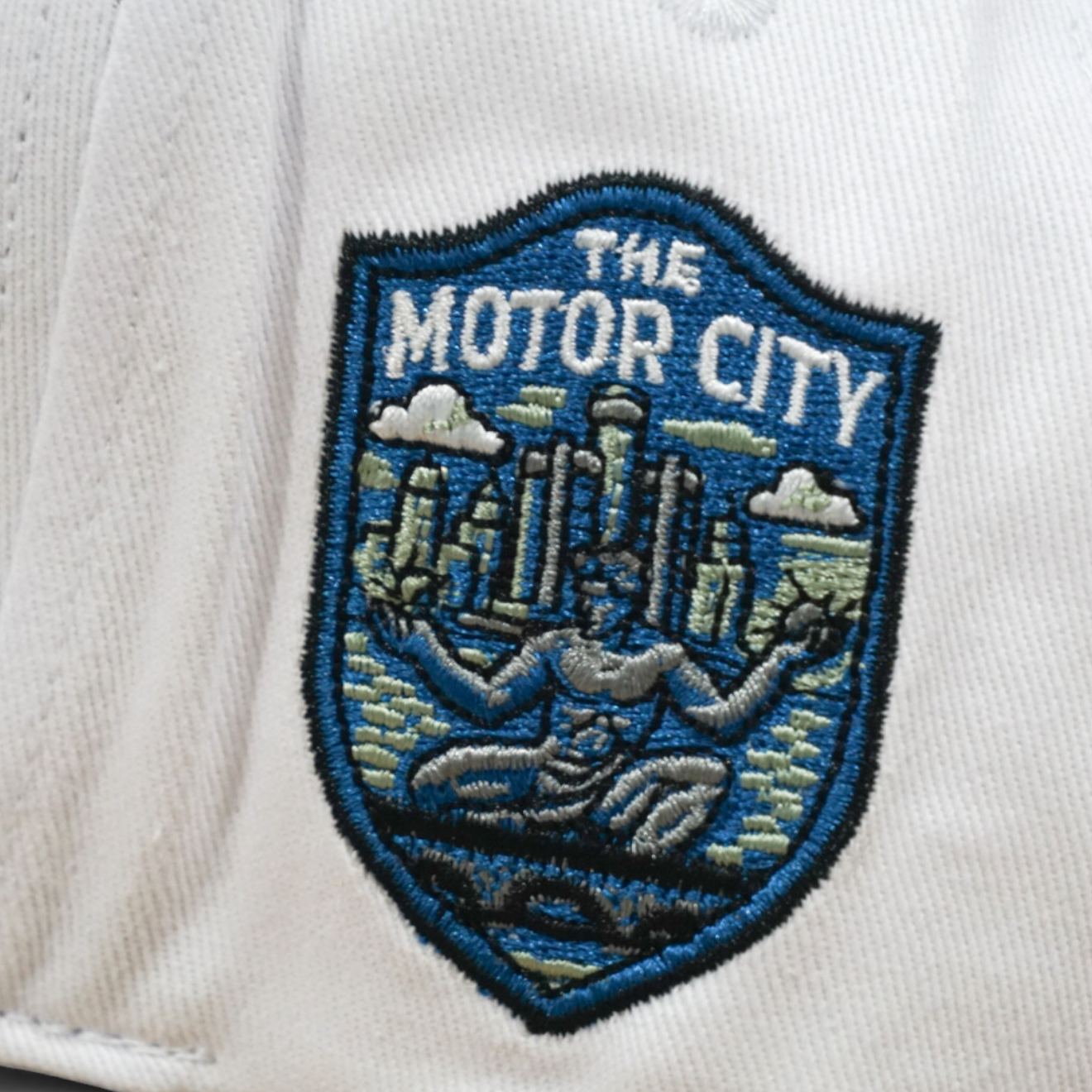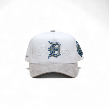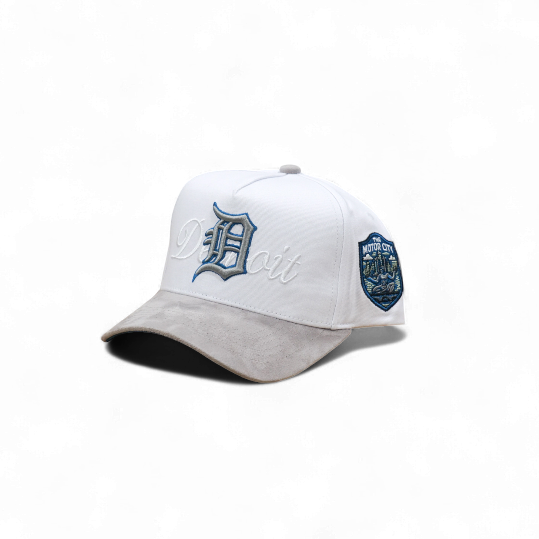 Classic five-panel snapback with Detroit pride. White crown features embroidered Motor City front logo, complemented by a side patch. Gray suede brim with blue corduroy underbrim adds texture and visual interest. Structured fit keeps its shape all day. Perfect for locals and visitors alike.