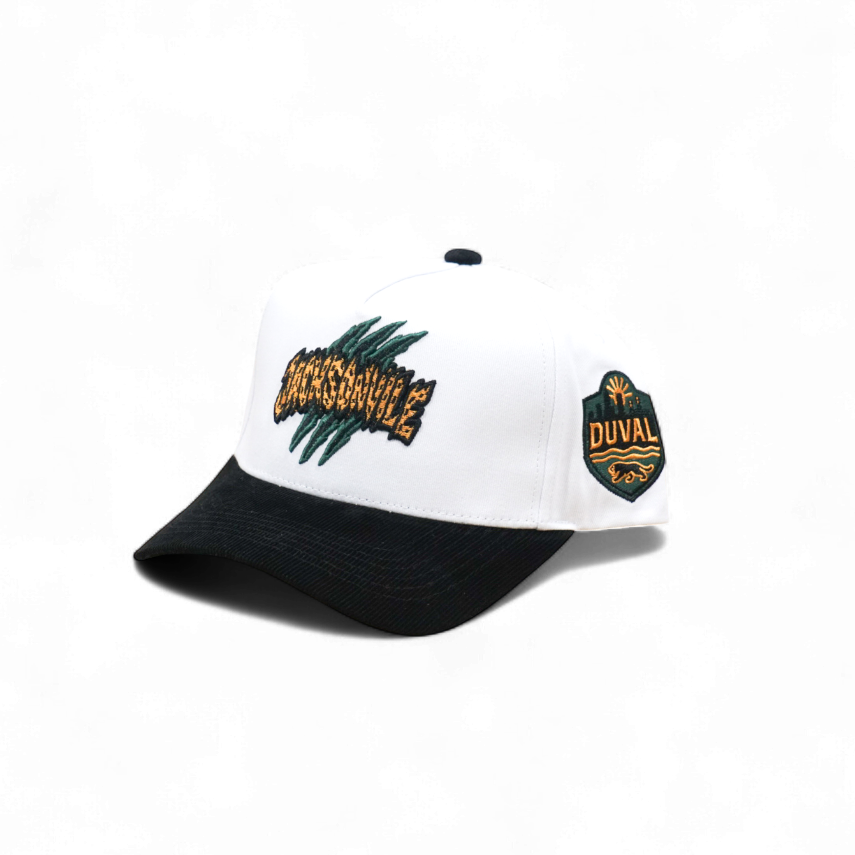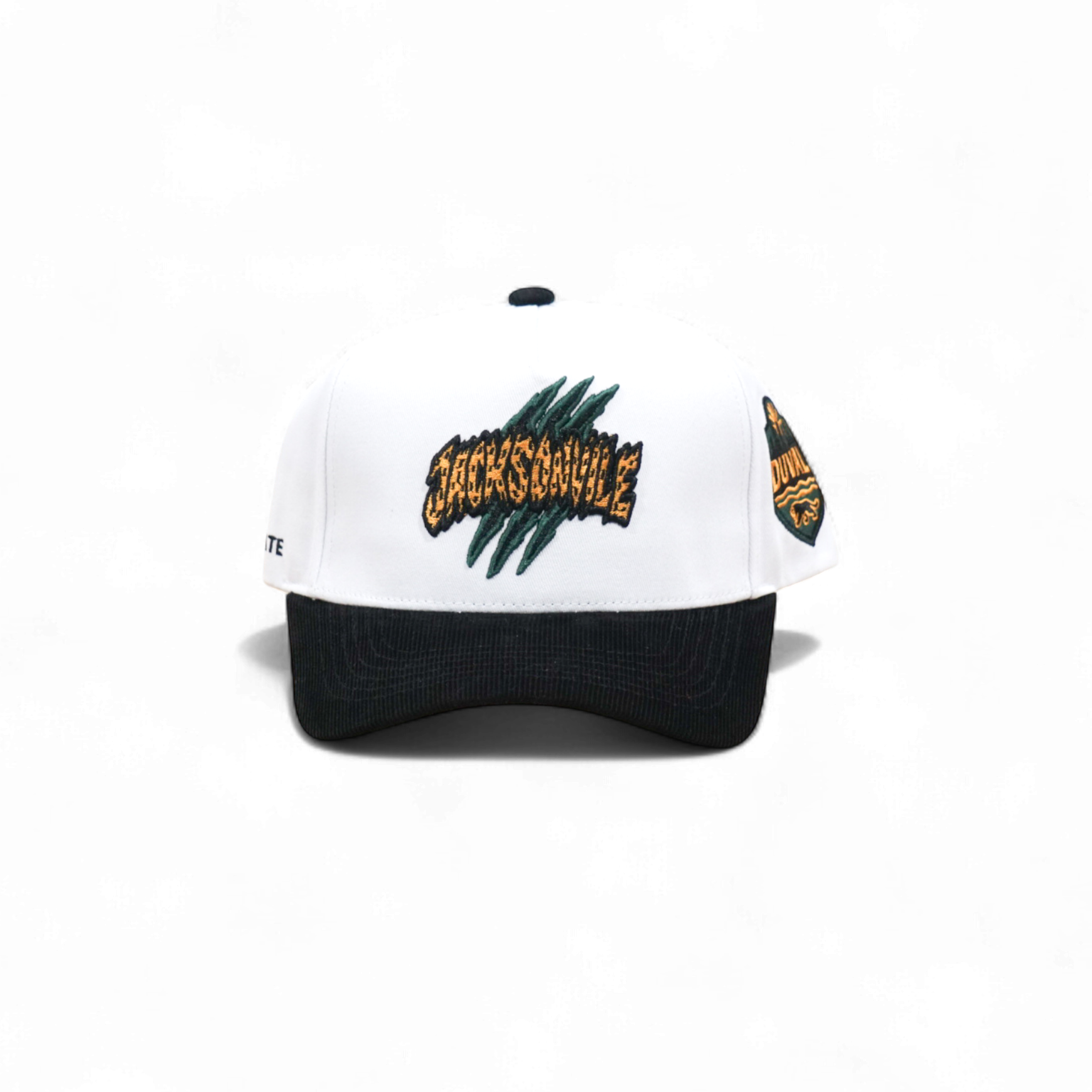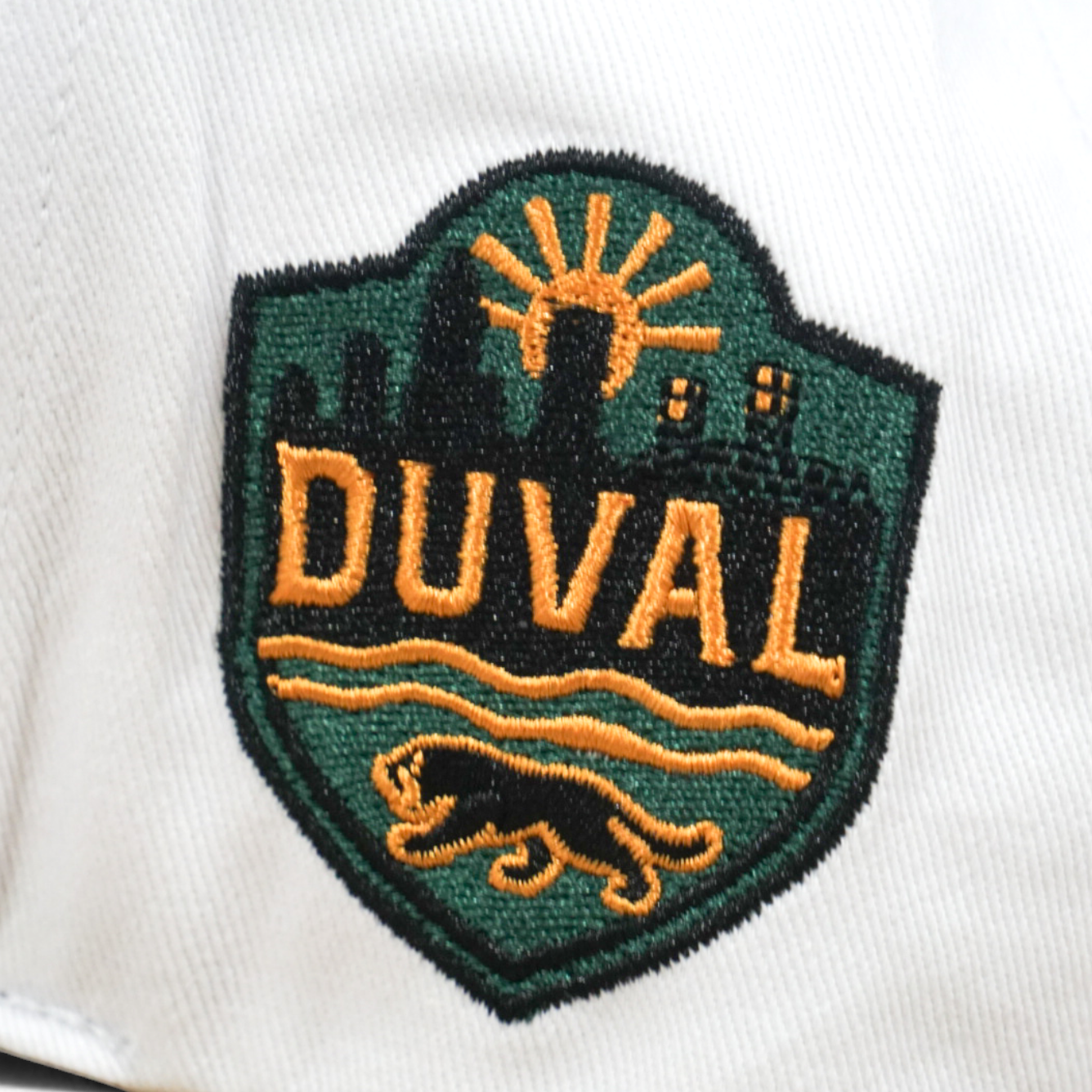 A classic 5-panel snapback with structured construction and deep fit. White crown pairs with a black corduroy brim for understated contrast. Features embroidered Duval side logo and Jacksonville front logo. Adjustable snap closure for a personalized fit.