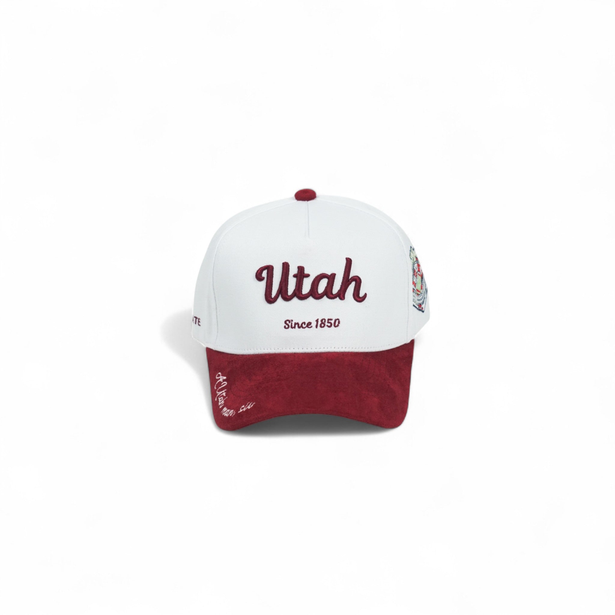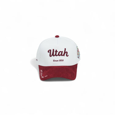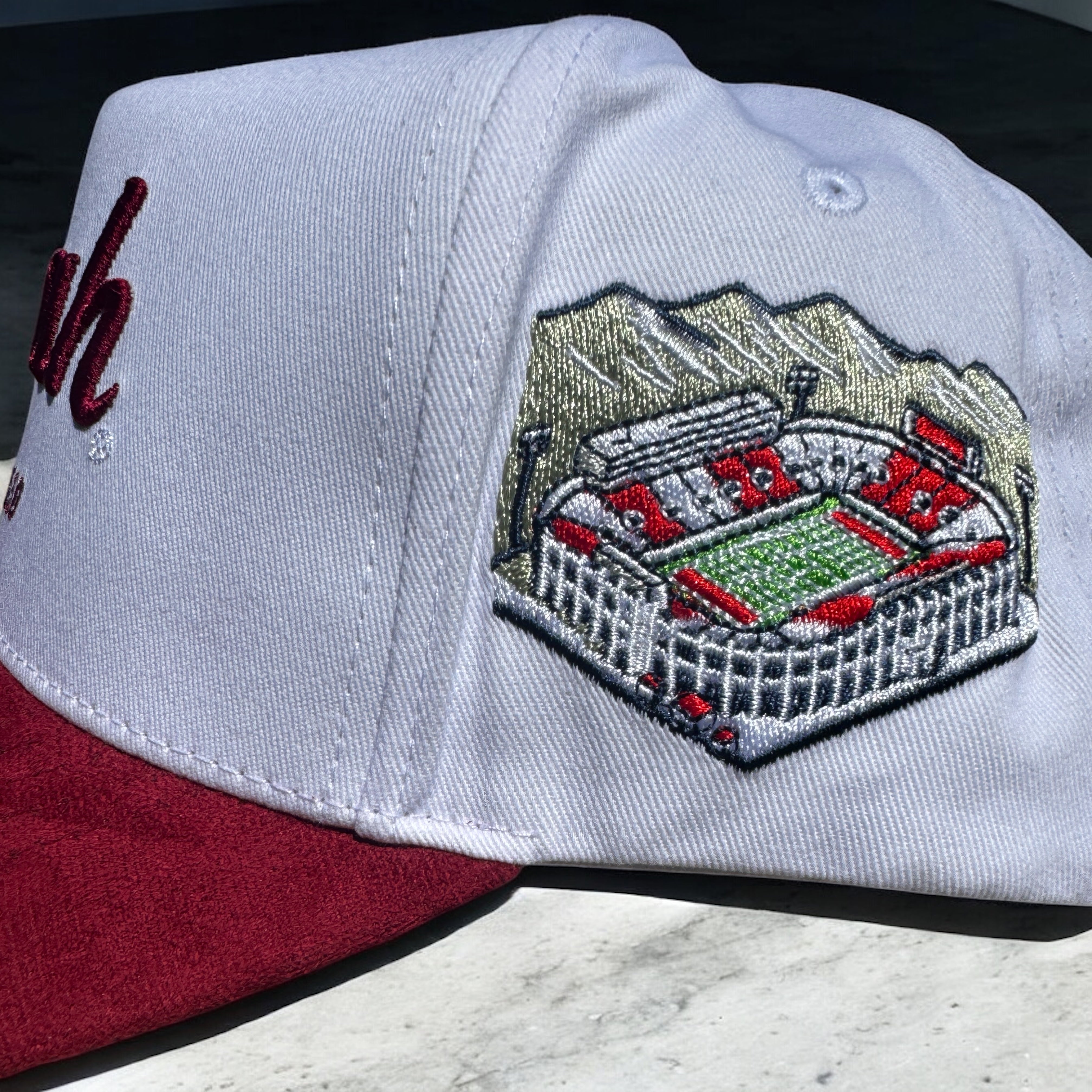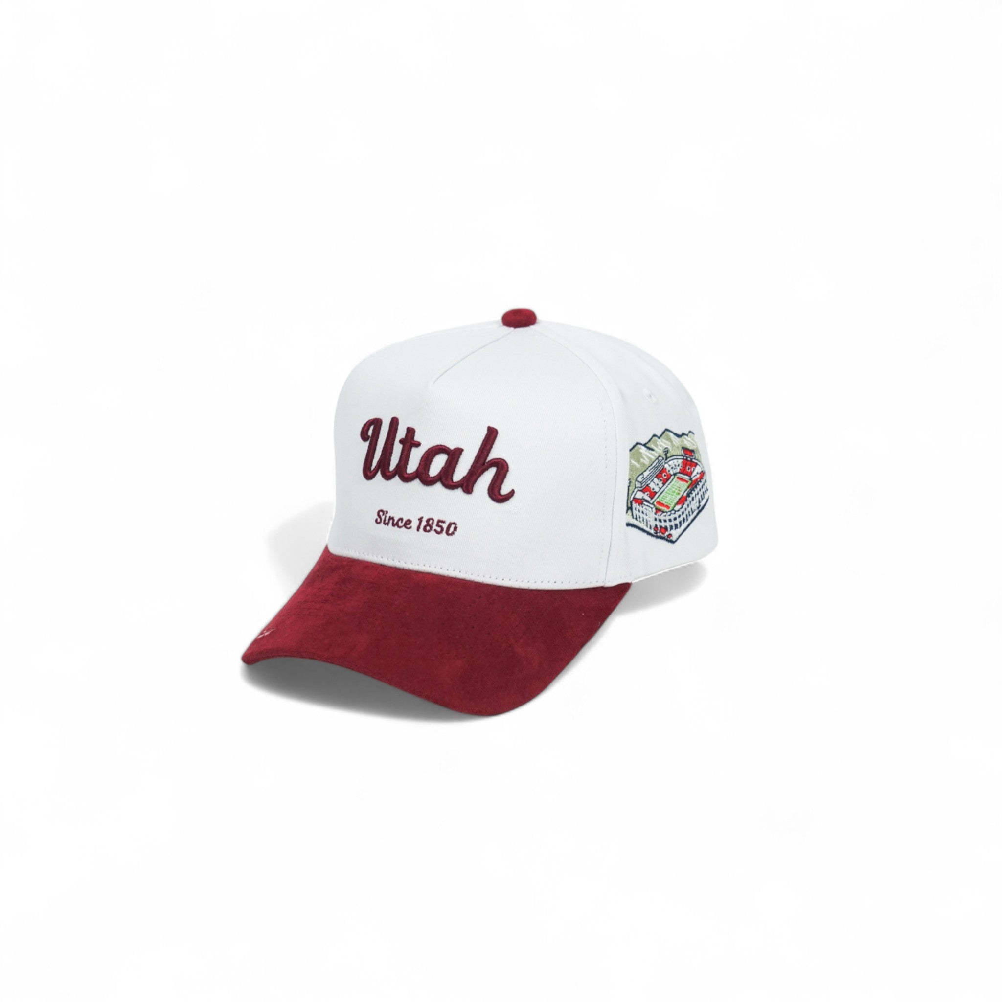 This Crimson Suede Utah hat has a clean white crown and a bold red suede brim, finished off with the embroidered phrase “A Utah man sir.” It also features a detailed Rice Eccles Stadium logo on the side. Made with quality materials for a comfortable fit, it’s a solid pick for any Utah fan looking to show some pride in style.
