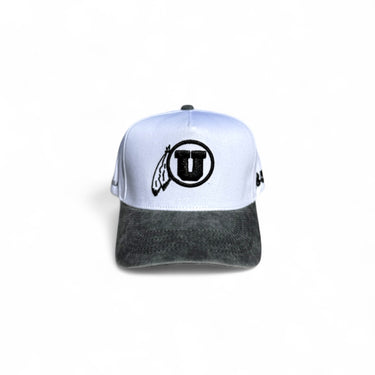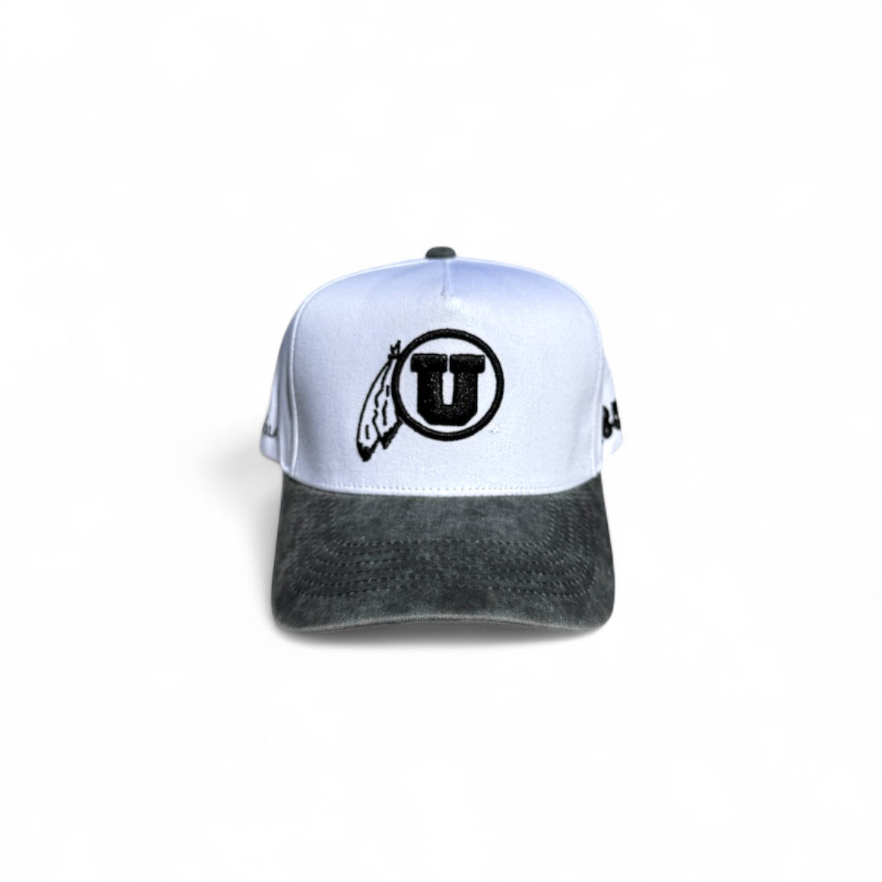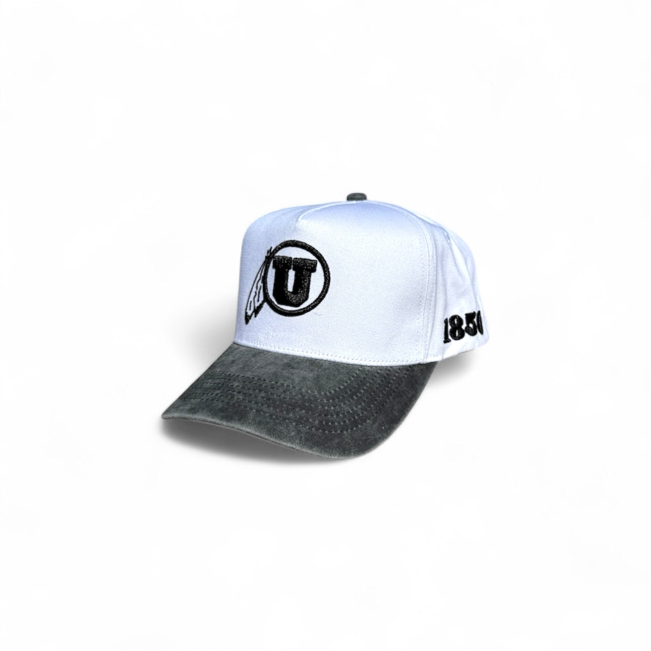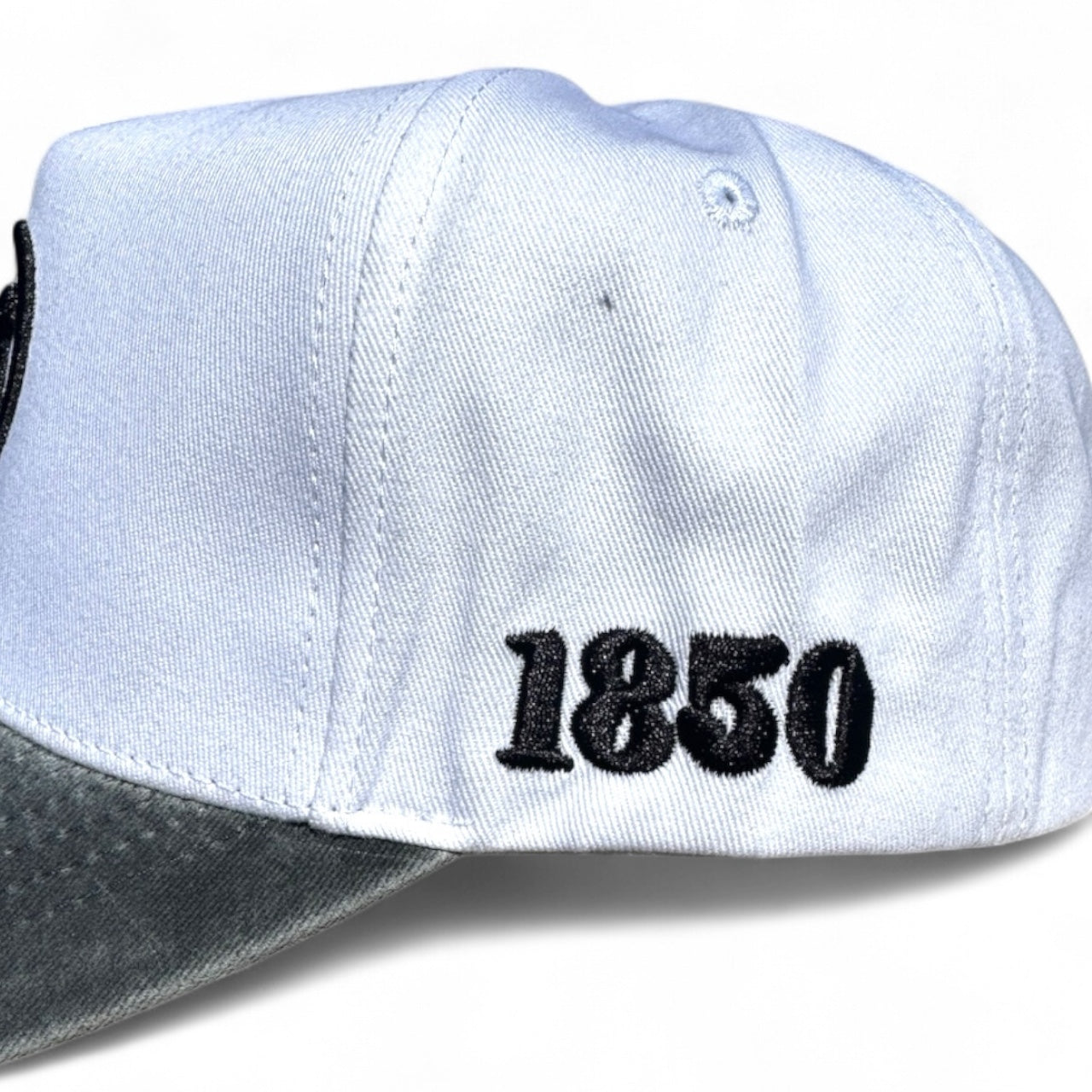 This five-panel cap features a clean white crown contrasted by a black faded brim. The front showcases a subtle black drum and feather logo, while the side is marked with a simple 1850 logo, combining understated style with meaningful details.