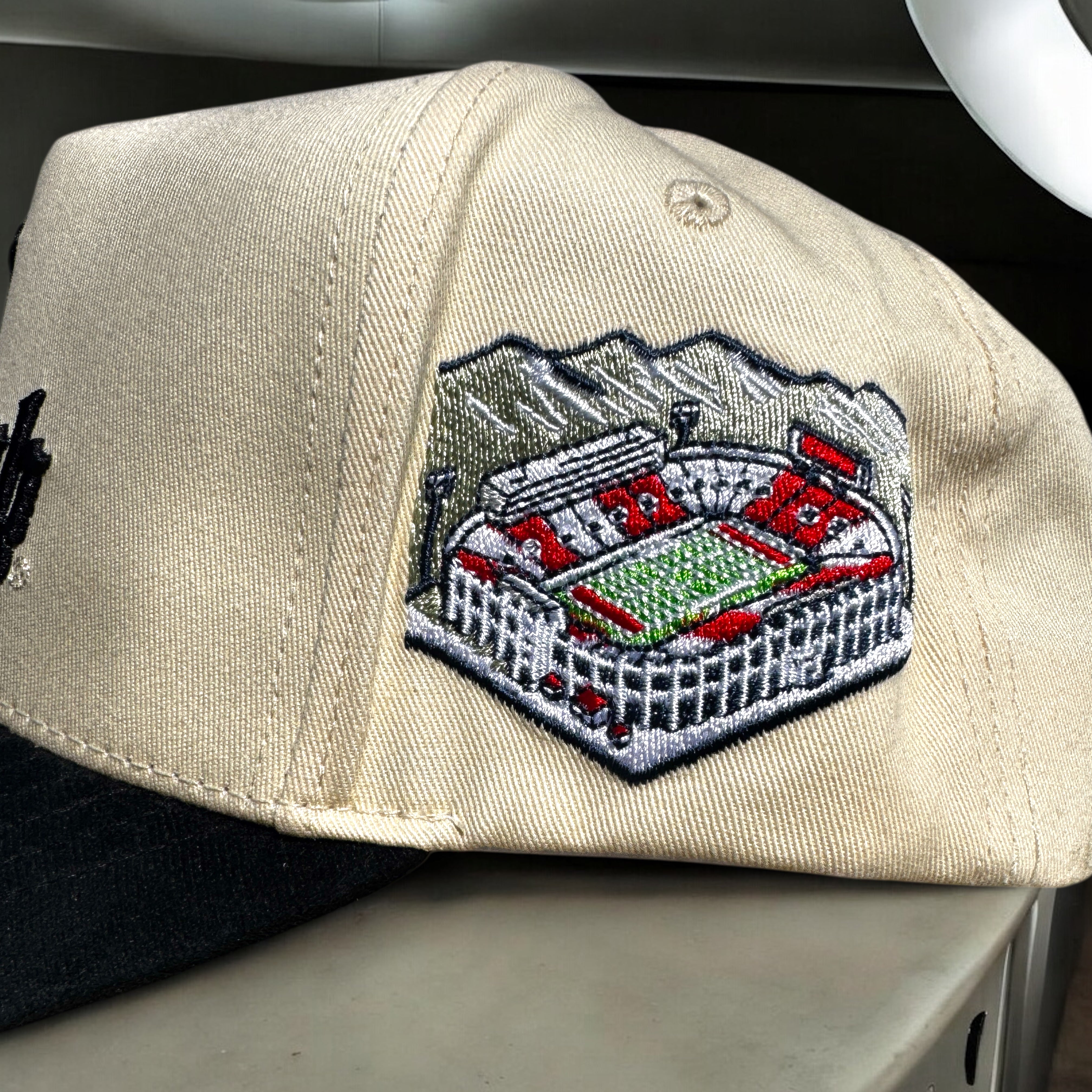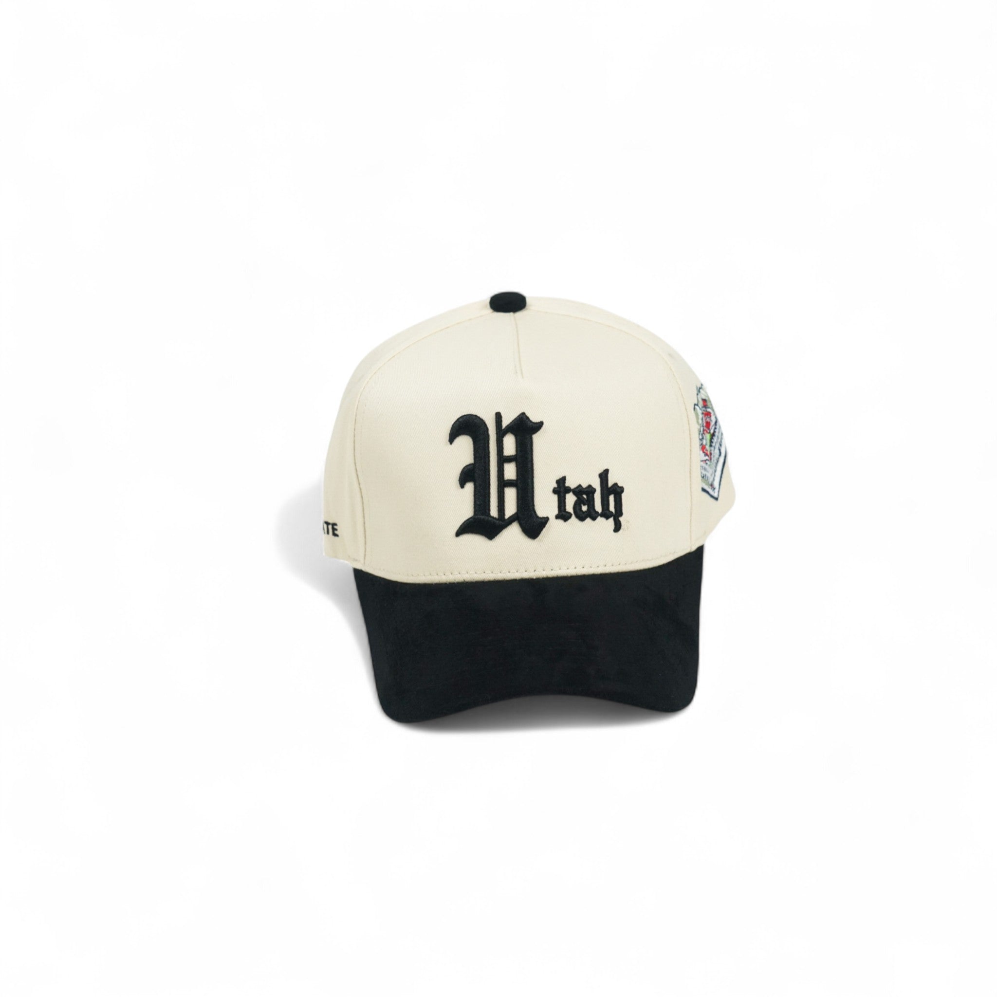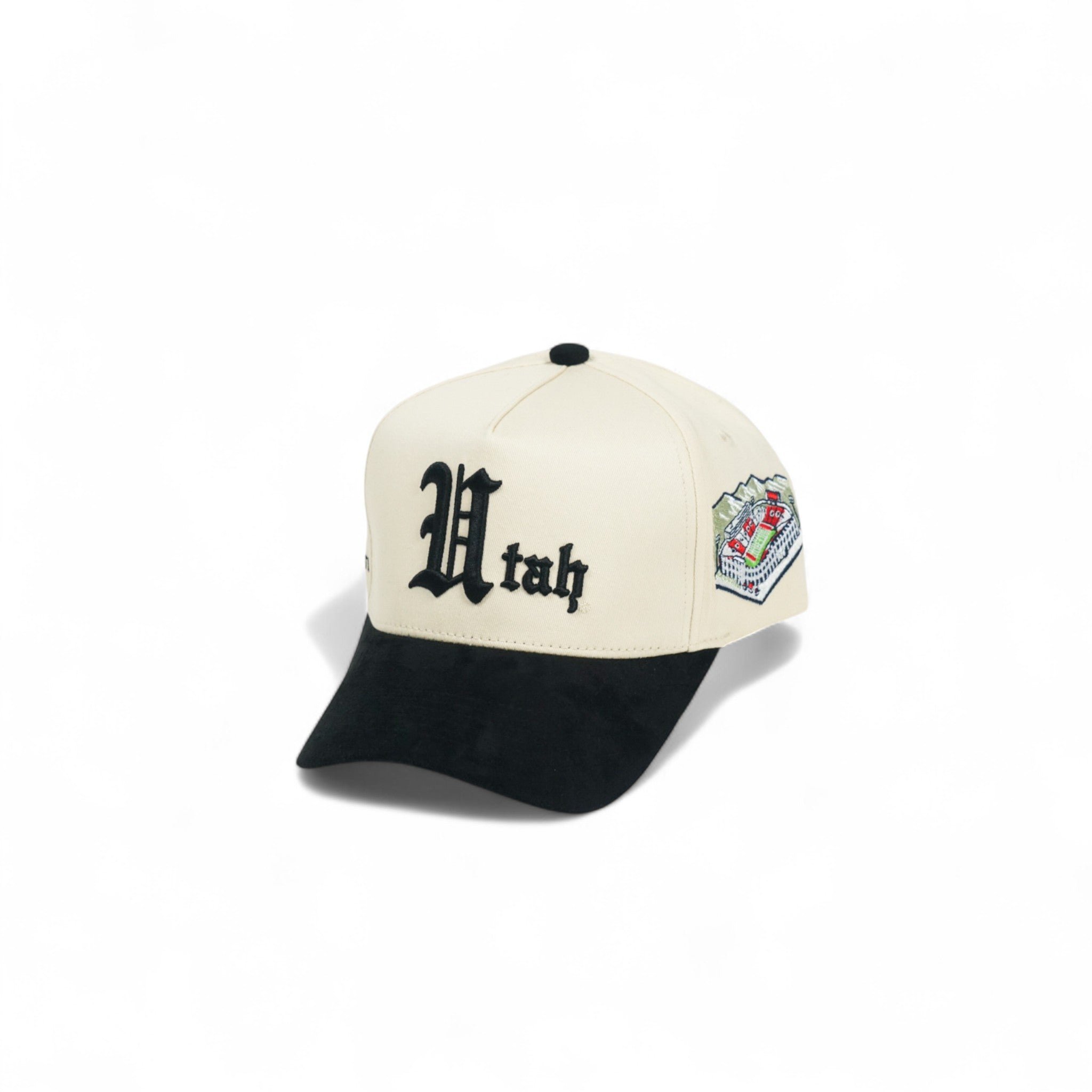 This 5-panel hat features a cream crown paired with a black suede brim for a sleek contrast. The front showcases a Utah gothic font logo, while the side displays a subtle red Rice Eccles Stadium detail, combining style with a nod to local pride. Designed for a deep, comfortable fit.