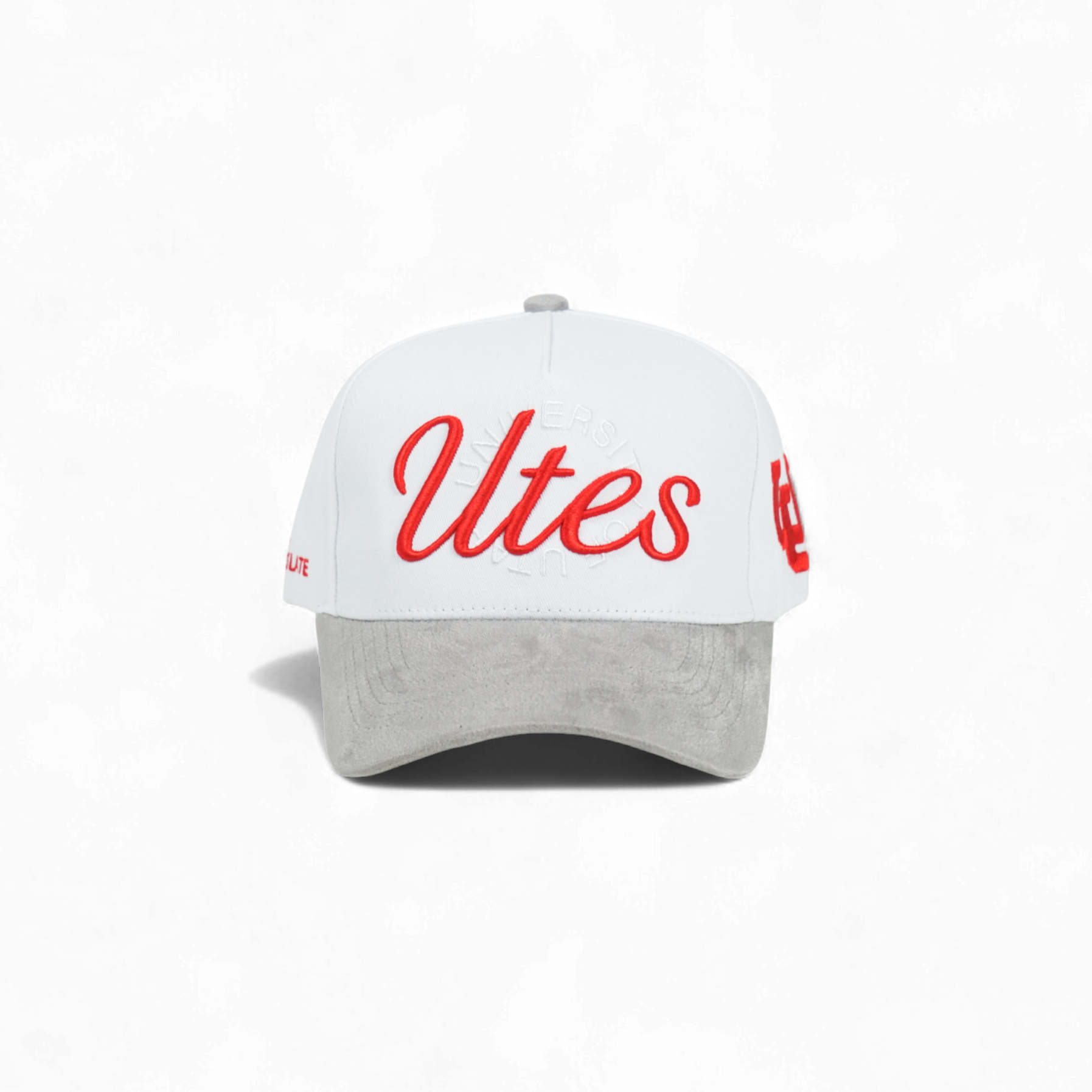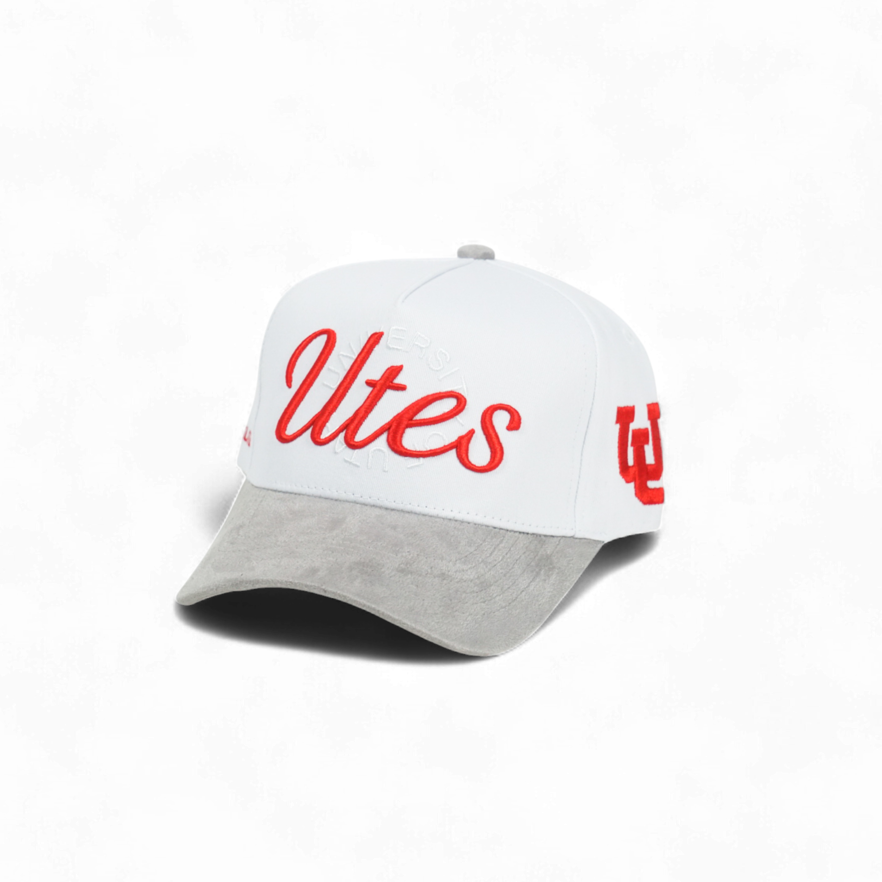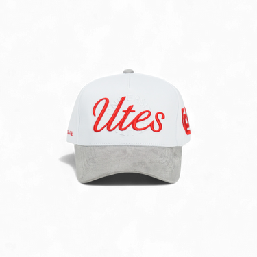 This 5-panel snapback features a deep fit design with a crisp white cotton crown and a gray suede brim for subtle texture. The front displays a bold red Utah logo, complemented by a U of U link logo on the side, combining classic elements with modern minimalism.