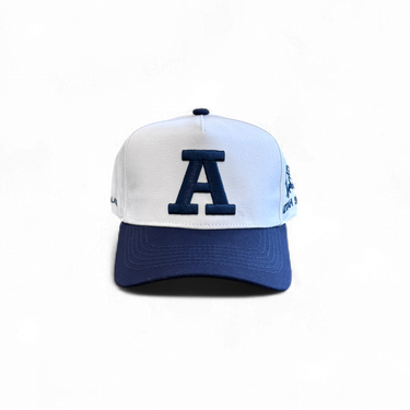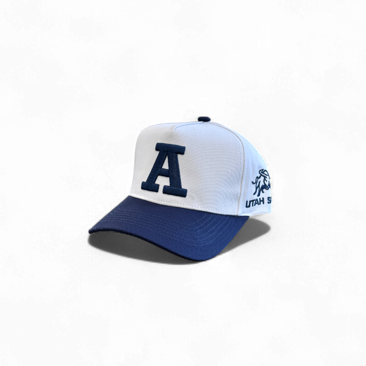 Classic 5-panel snapback with structured deep fit. White crown features front logo with Utah state emblem on the side. Navy brim pairs with gray suede underbrim for refined contrast. Timeless design built for everyday wear.