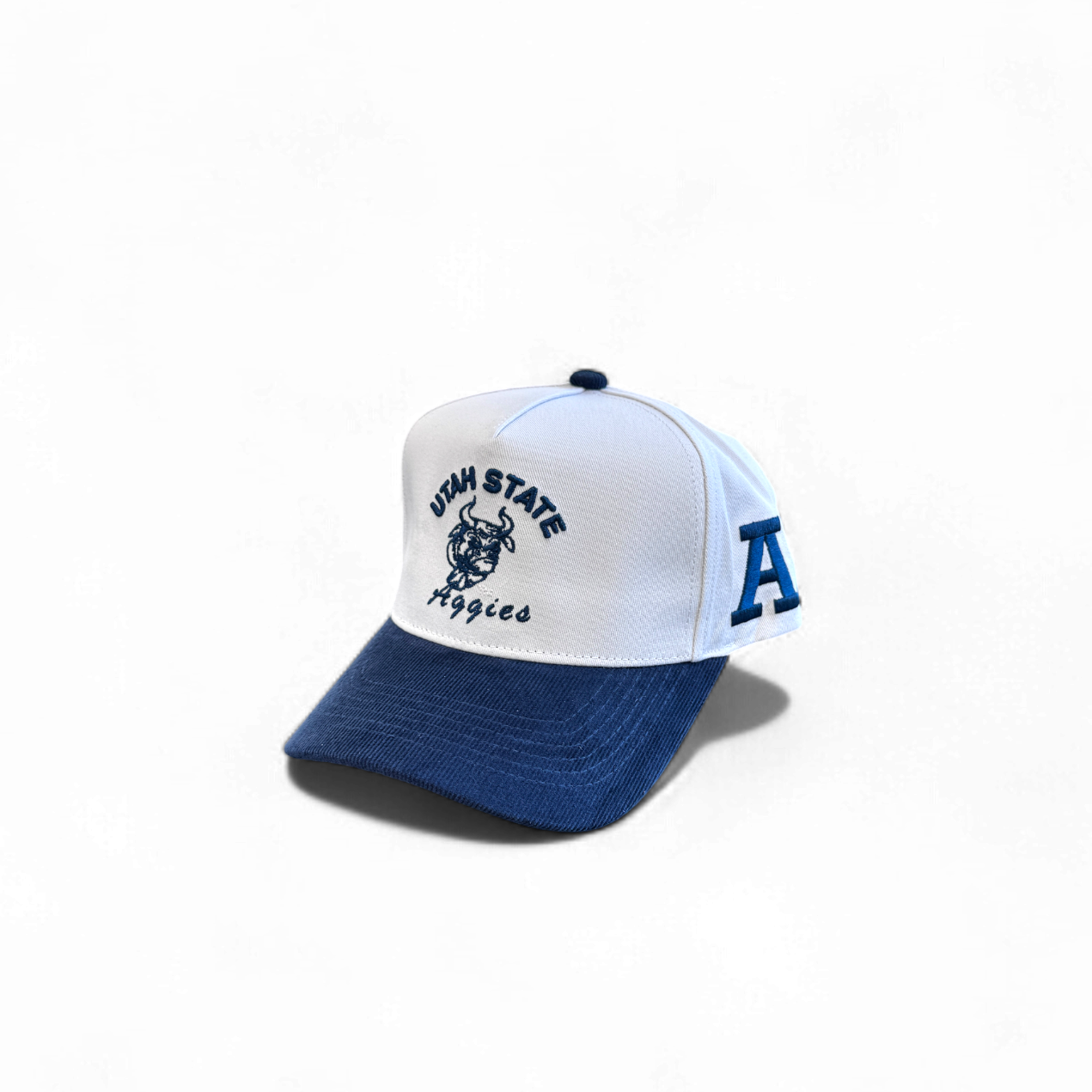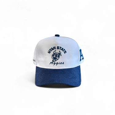 Classic 5-panel snapback with structured deep fit. White crown pairs with navy corduroy brim and gray suede underbrim for understated contrast. Side logo detail. Timeless design built for everyday wear.
