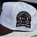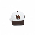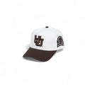 This 5-panel structured hat features a deep fit with a white crown and brown brim. It showcases a front logo representing Utah and a side logo commemorating the 175th anniversary, blending style with subtle celebration.