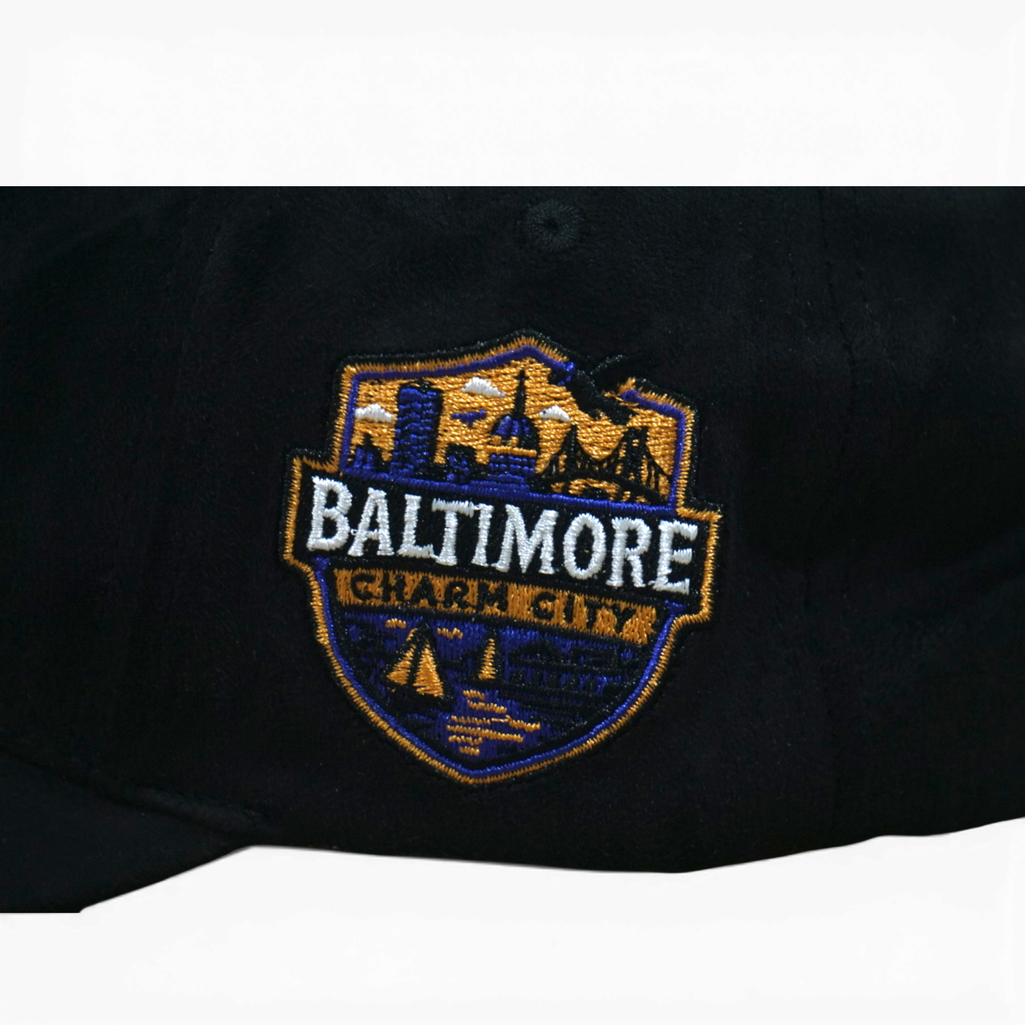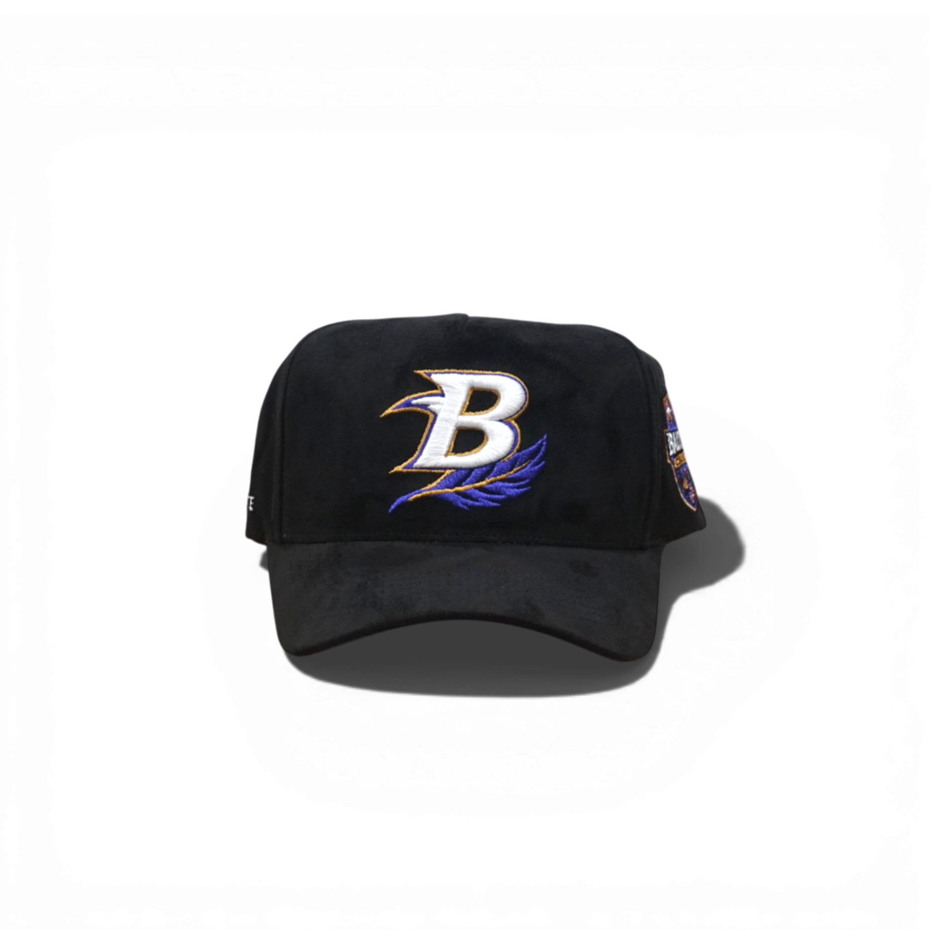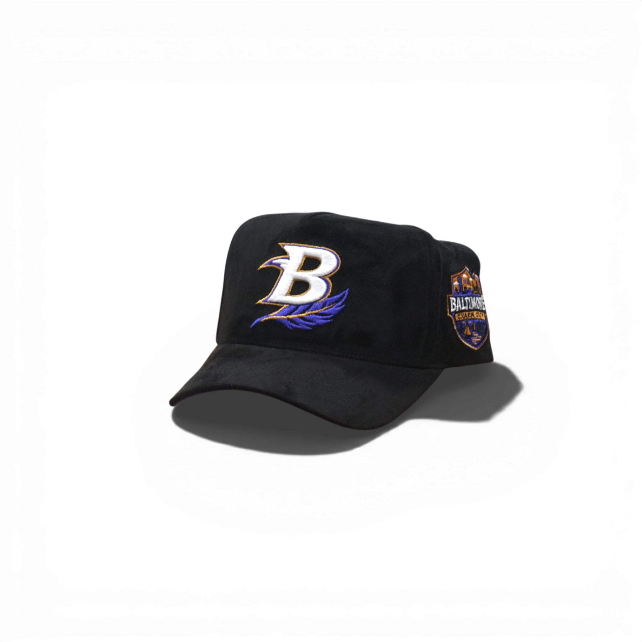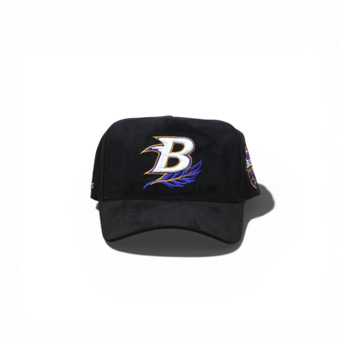 A classic 5-panel snapback with structured construction and deep fit. Features a bold B front logo and Baltimore side embroidery on premium black suede. Adjustable snap closure for a personalized fit.