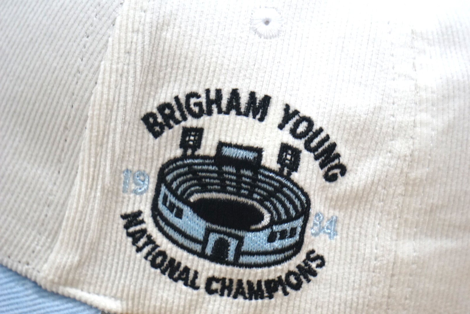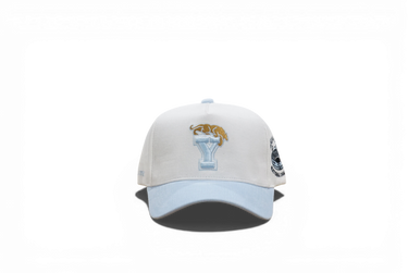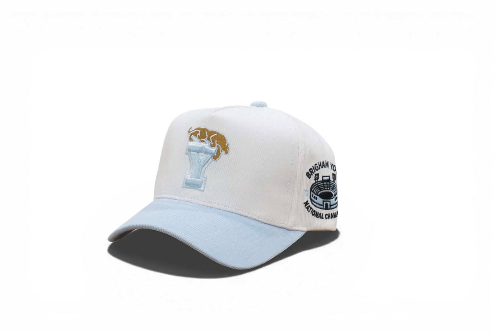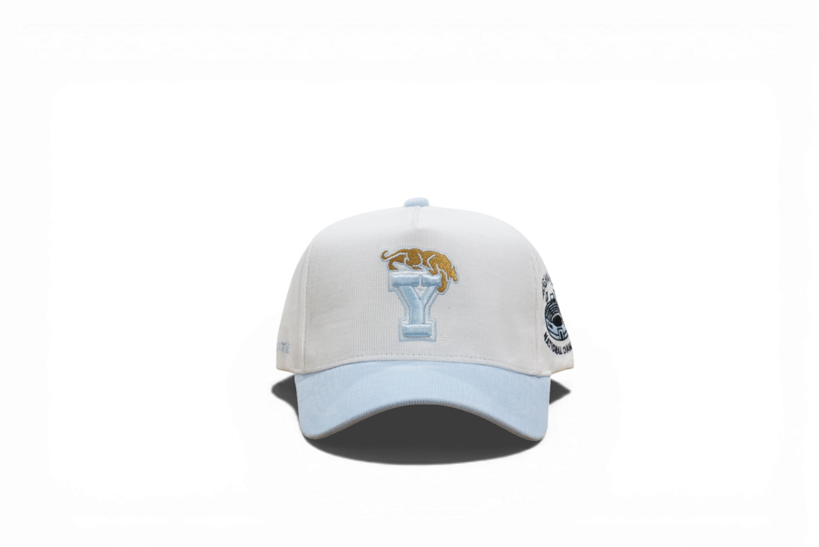 Classic 5-panel snapback with structured deep fit and corduroy construction. White crown pairs with baby blue brim and matching front Y logo. Stadium side logo adds subtle branding. Adjustable snap closure for a personalized fit.