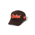 This five-panel hat features a brown fabric base with a bold orange front logo reading "Cleveland." It includes an orange underbrim and a matching Cleveland side patch, offering a clean and cohesive design. Ideal for showing support with subtle style.