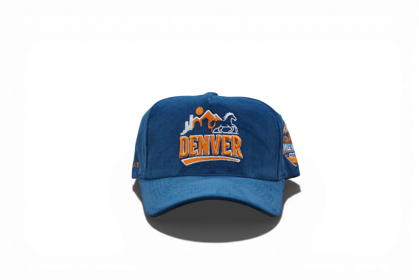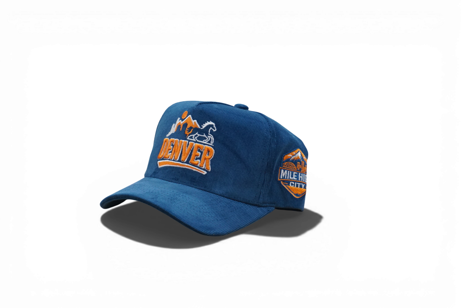 Classic 5-panel snapback with structured deep fit and full blue corduroy construction. Features Denver front logo and Mile High City side embroidery. Durable snap closure adjusts to fit most. Perfect for everyday wear or showing local pride.