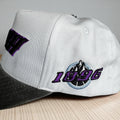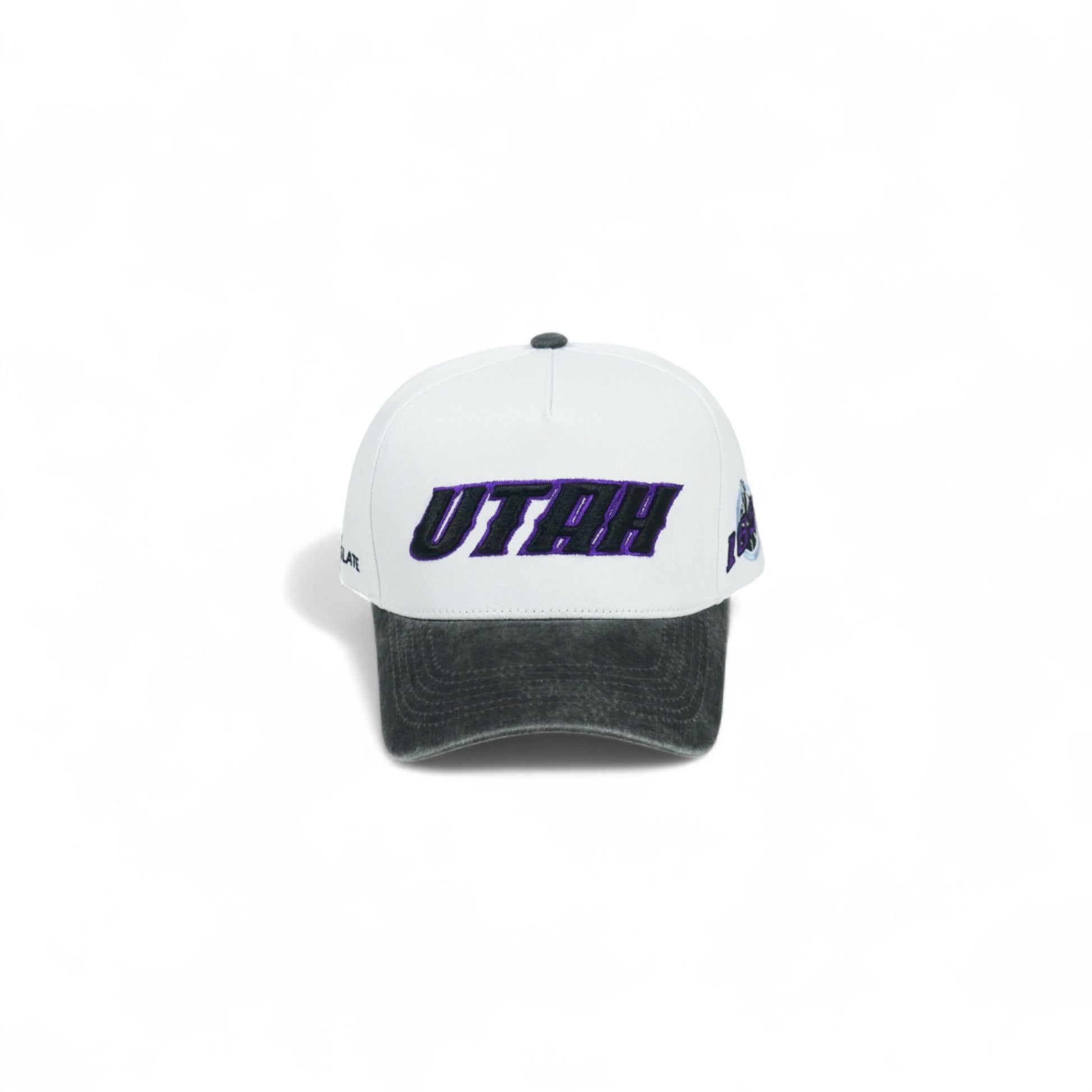 This 5-panel structured hat features a deep fit for comfortable wear. It combines a black faded, washed brim with a crisp white crown, showcasing a Utah Front logo outlined in purple and a subtle 1896 side logo for a clean, minimalistic look.