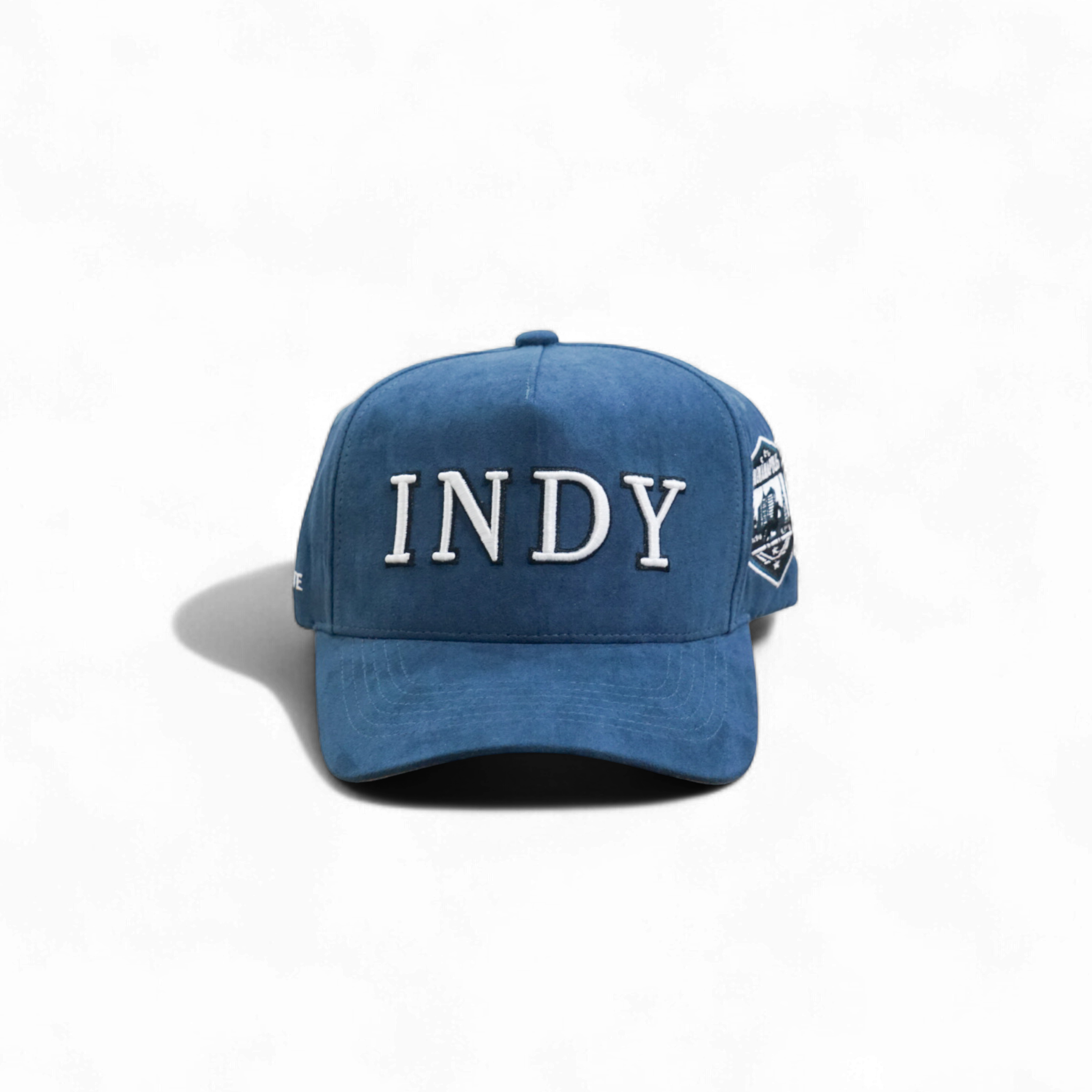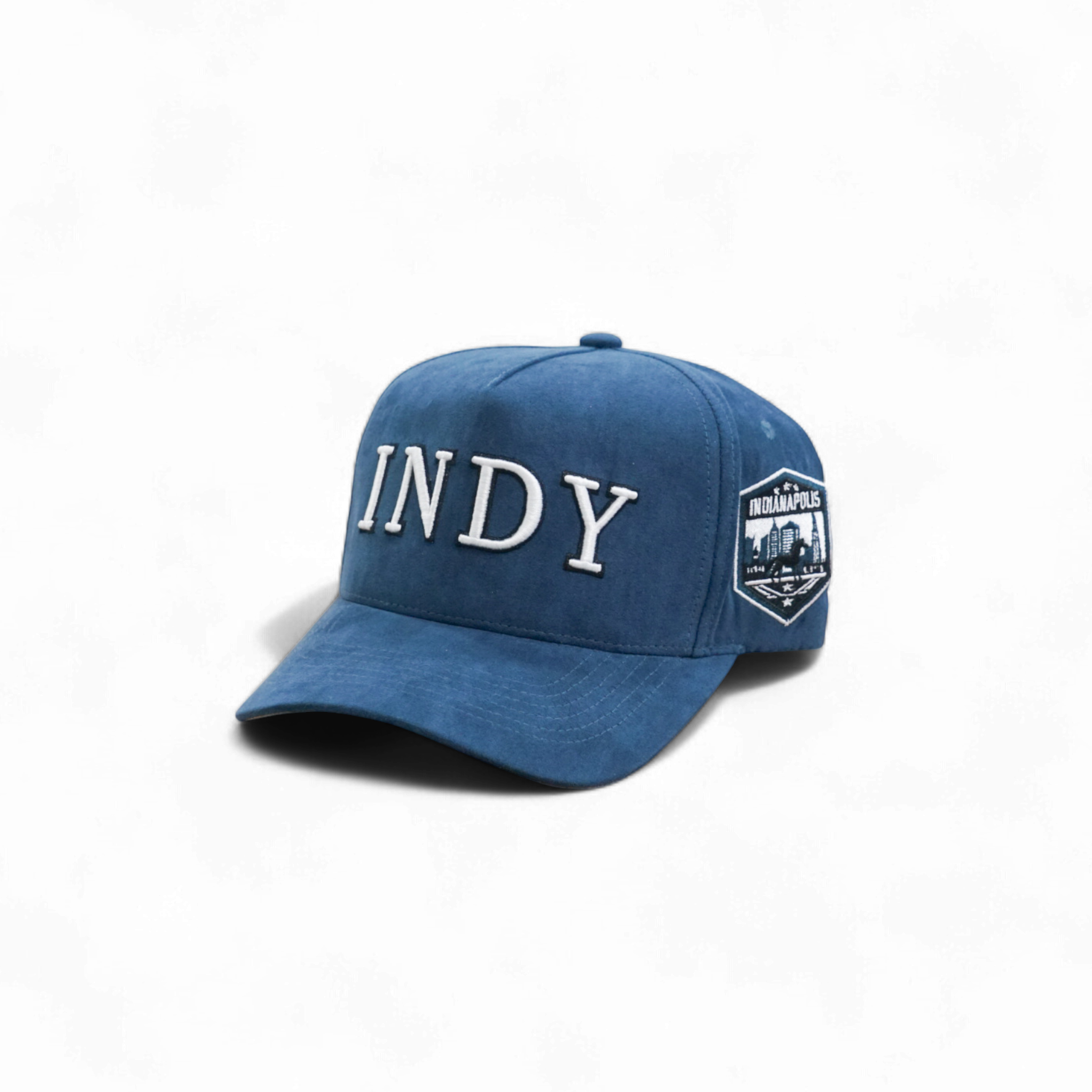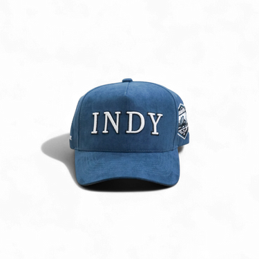 Experience comfort and style with the INDY Suede structured 5 panel hat. Featuring a high-quality blue suede exterior and a gray suede underbrim, this hat showcases the iconic INDY front logo and an Indianapolis side logo. Perfect for any fan or fashion-forward individual.