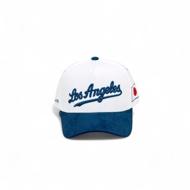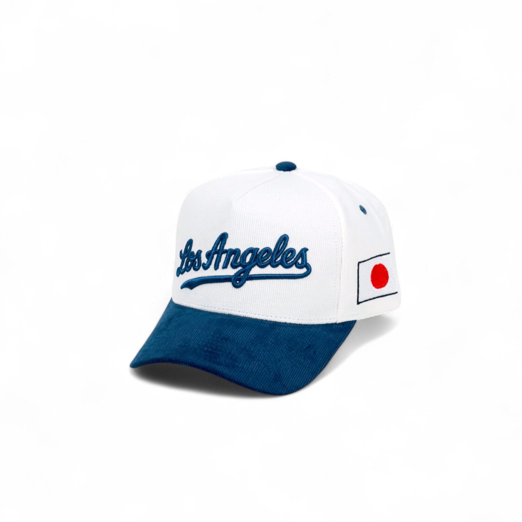 This structured 5-panel hat features a deep fit for comfortable wear. Crafted from full corduroy fabric, it displays a Los Angeles logo on the front and a Japan flag logo on the side. The snapback includes subtle Japanese-inspired details, blending style and cultural elements in a clean, minimal design.