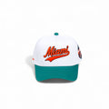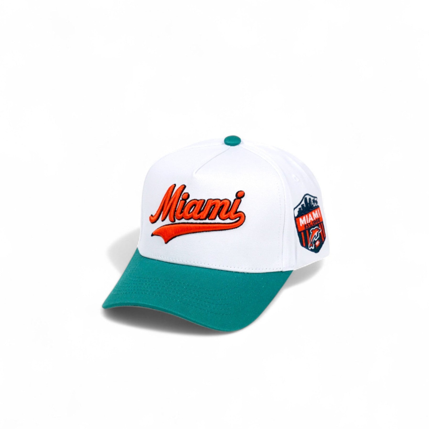 This 5-panel structured Miami hat features an orange front logo paired with a teal brim for a clean, vibrant look. A subtle Miami-themed logo on the side adds a unique touch without overwhelming the design.