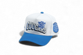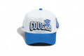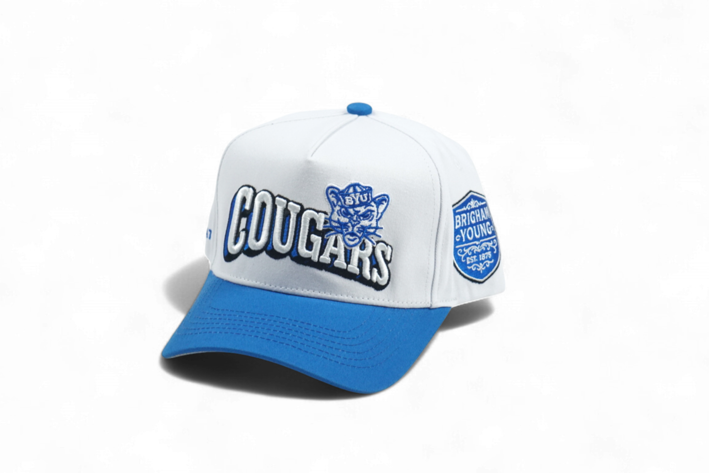 This 5-panel deep fit snapback features a clean white crown paired with a royal blue brim. It displays a bold Cougars logo on the front and a subtle vintage emblem on the side. The gray suede underbrim adds a refined touch to this classic design.