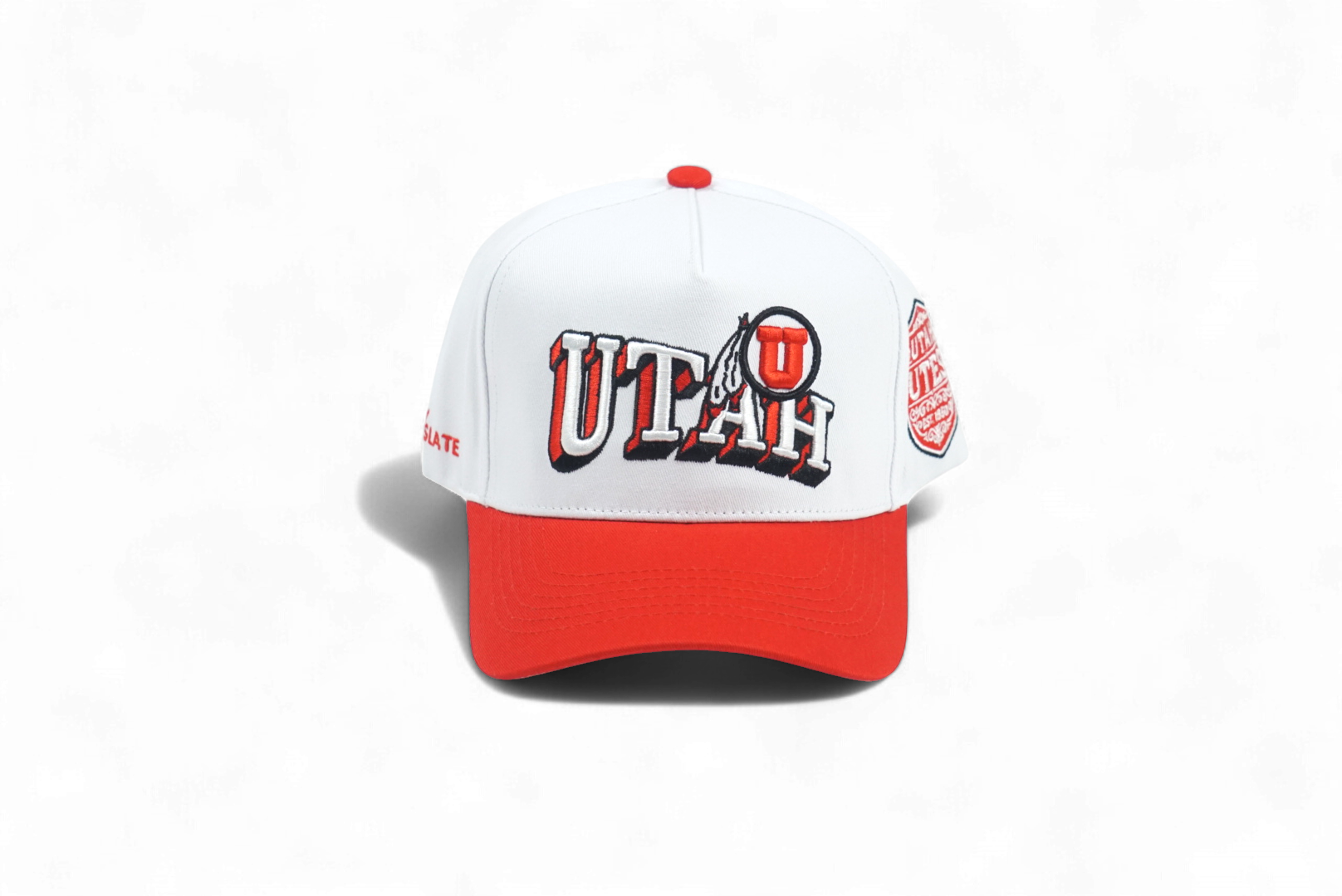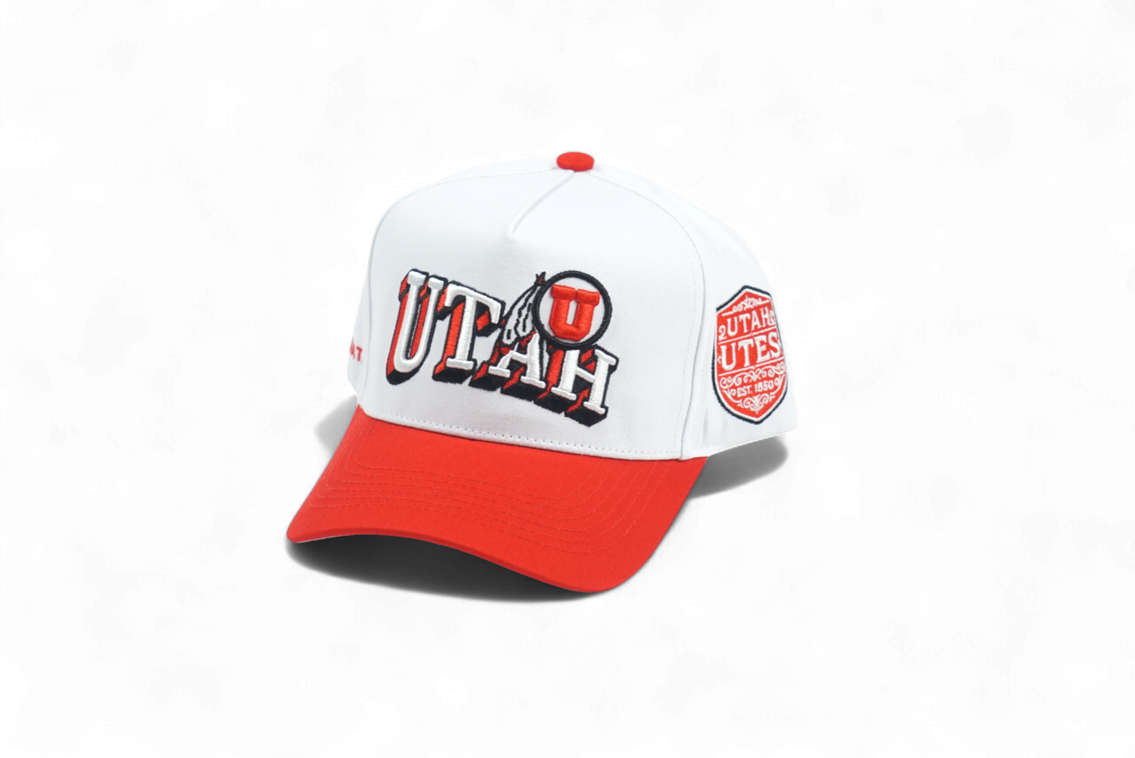 This 5-panel deep fit snapback features a clean white crown contrasted by a red brim. The front showcases a sharp Utah logo, while a vintage emblem adds subtle character on the side. Designed for a comfortable fit with a minimalist style.