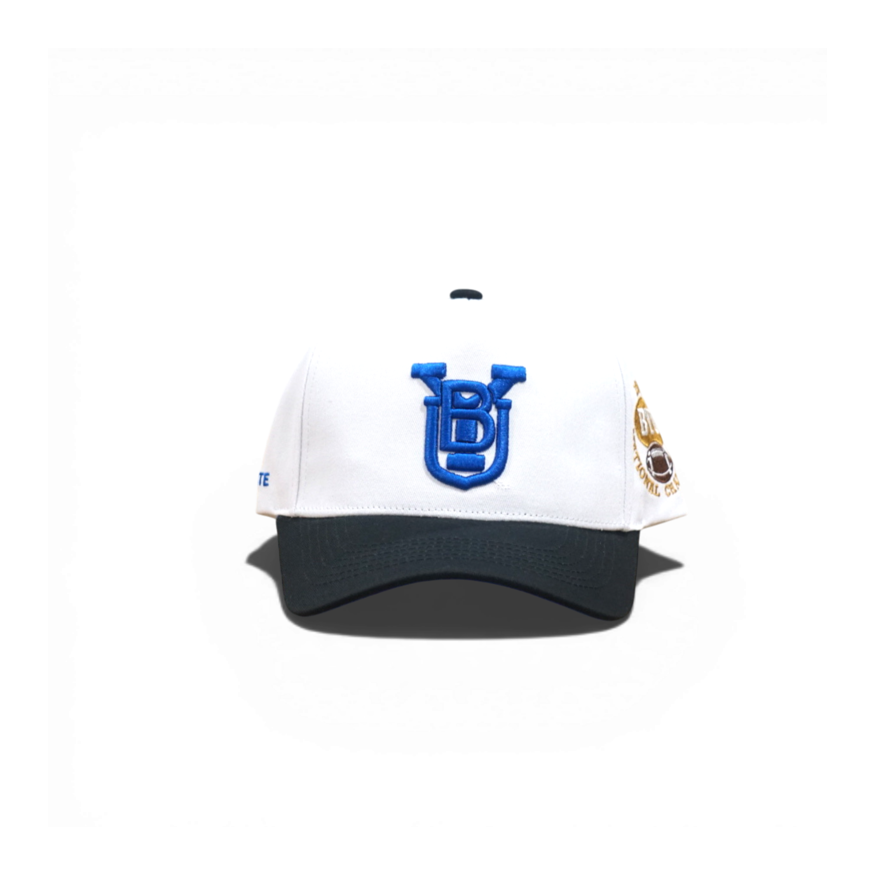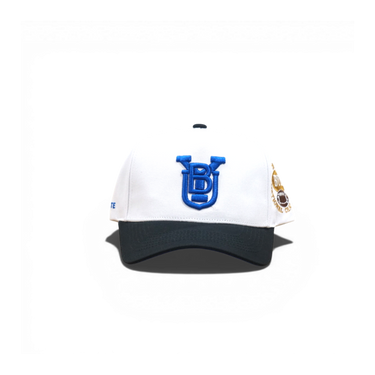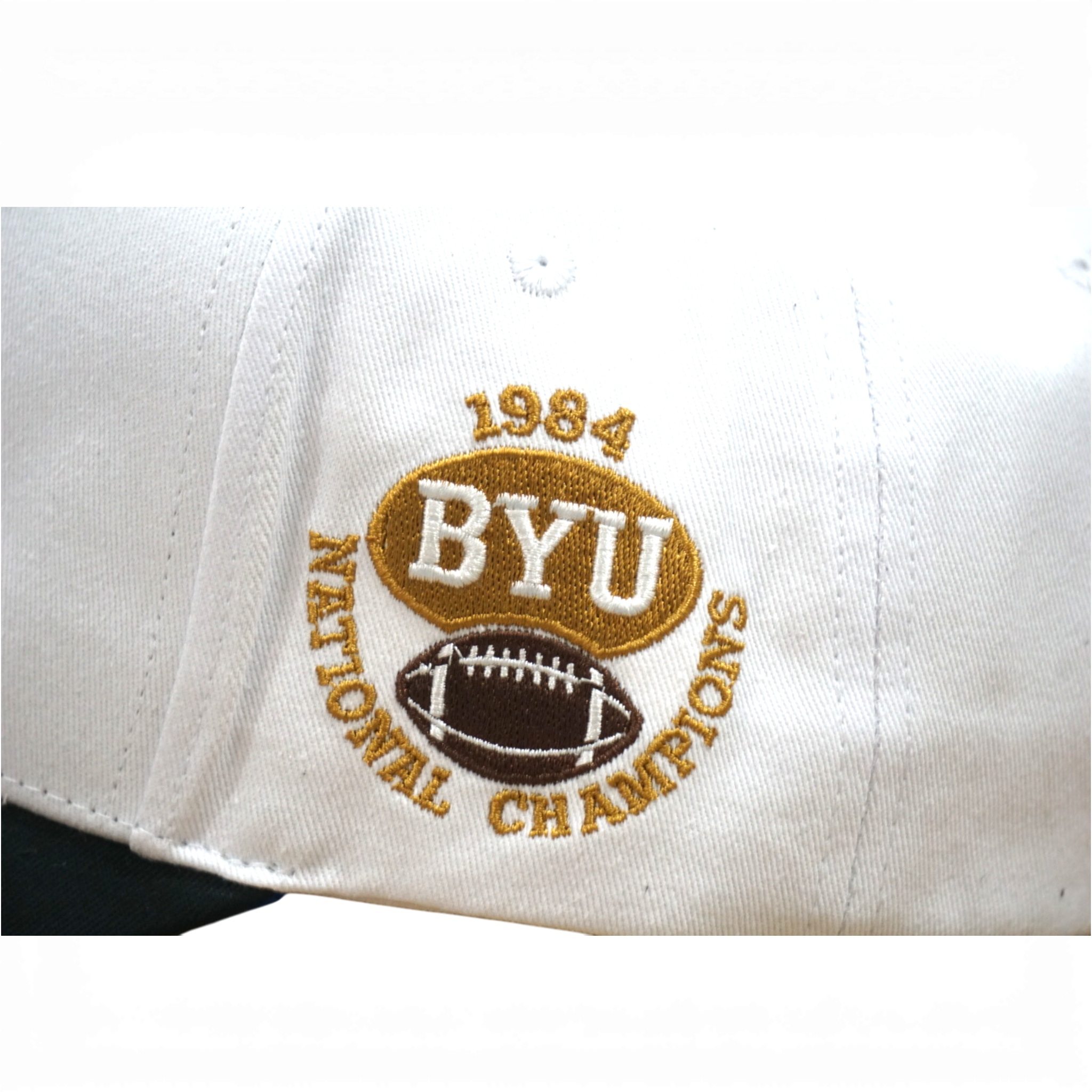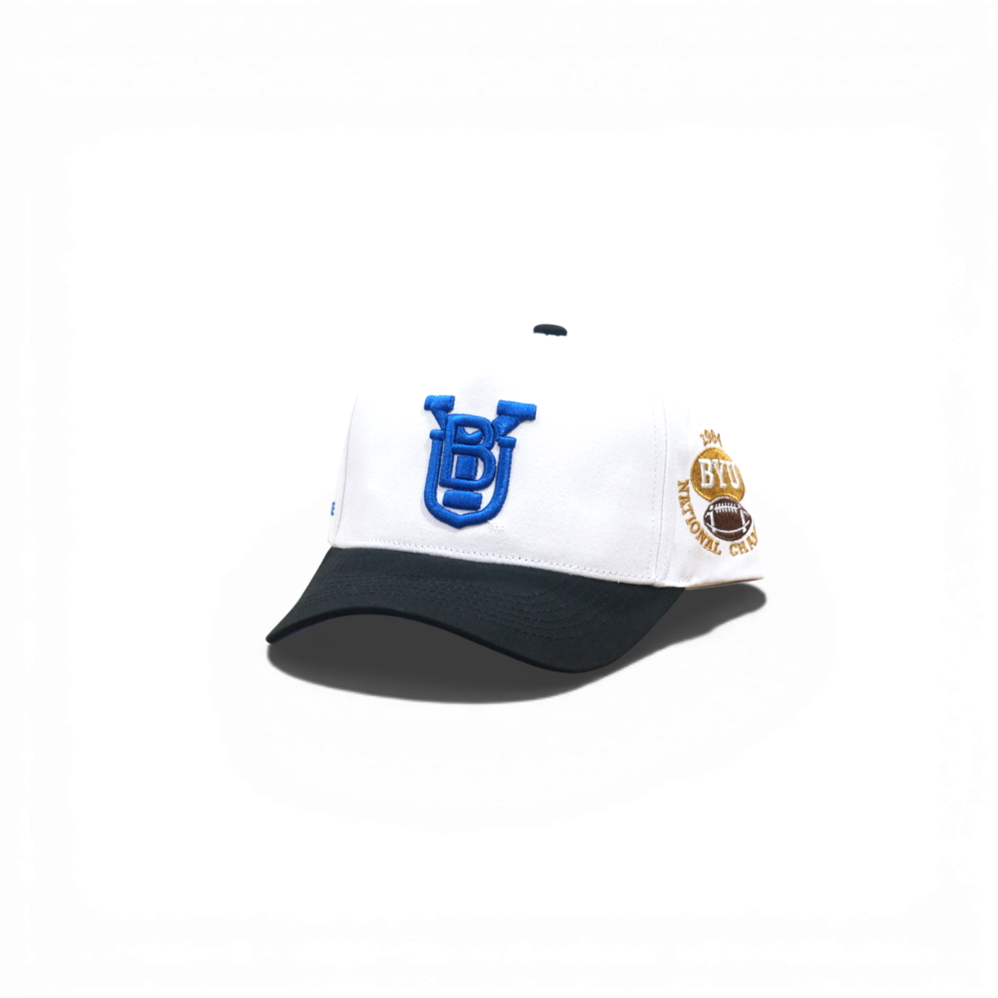 Structured 5-panel snapback with stacked BYU front logo in royal blue and white. Features a white crown, black brim, and royal suede underbrim. National Champions side logo completes the design. Deep fit construction for a classic, tailored look.