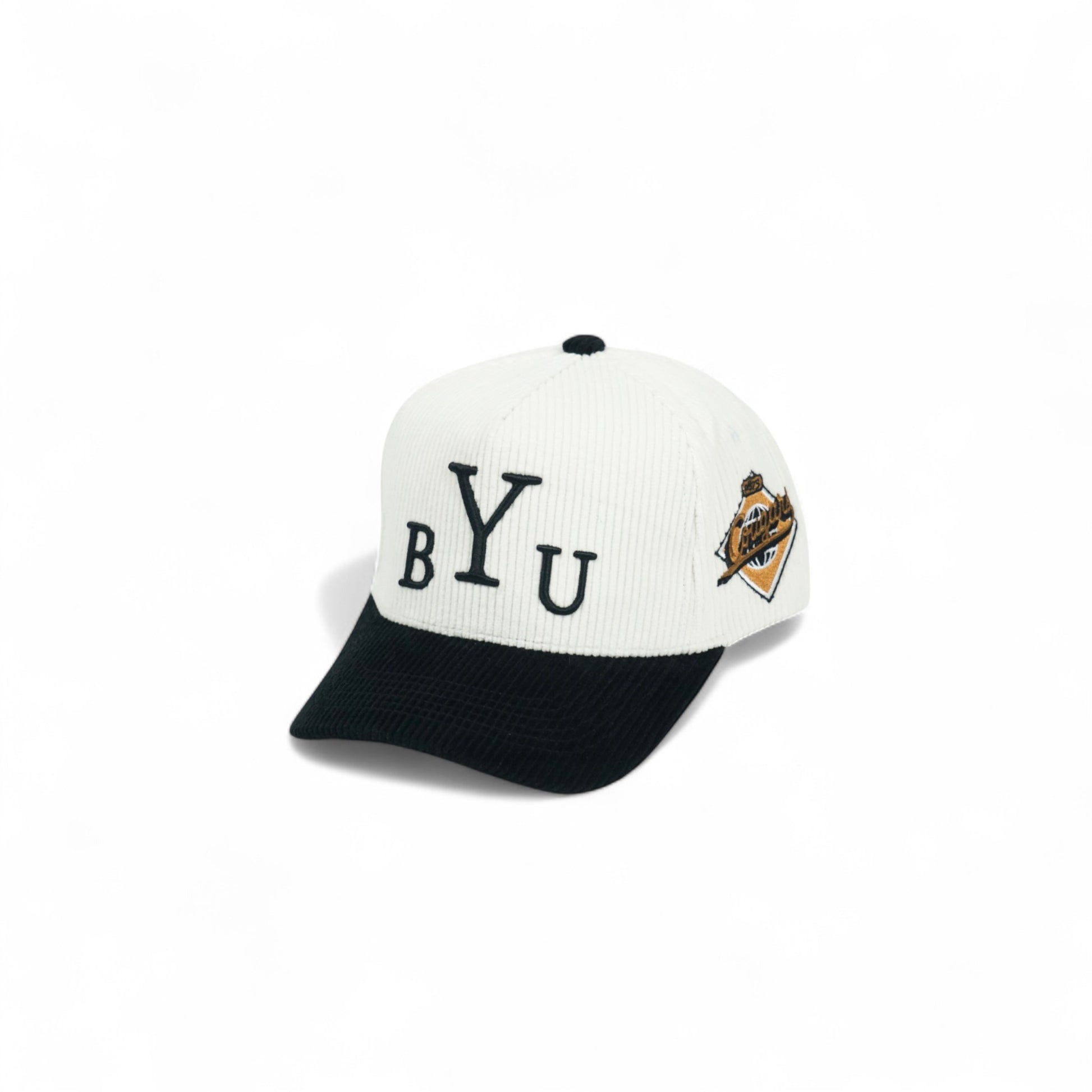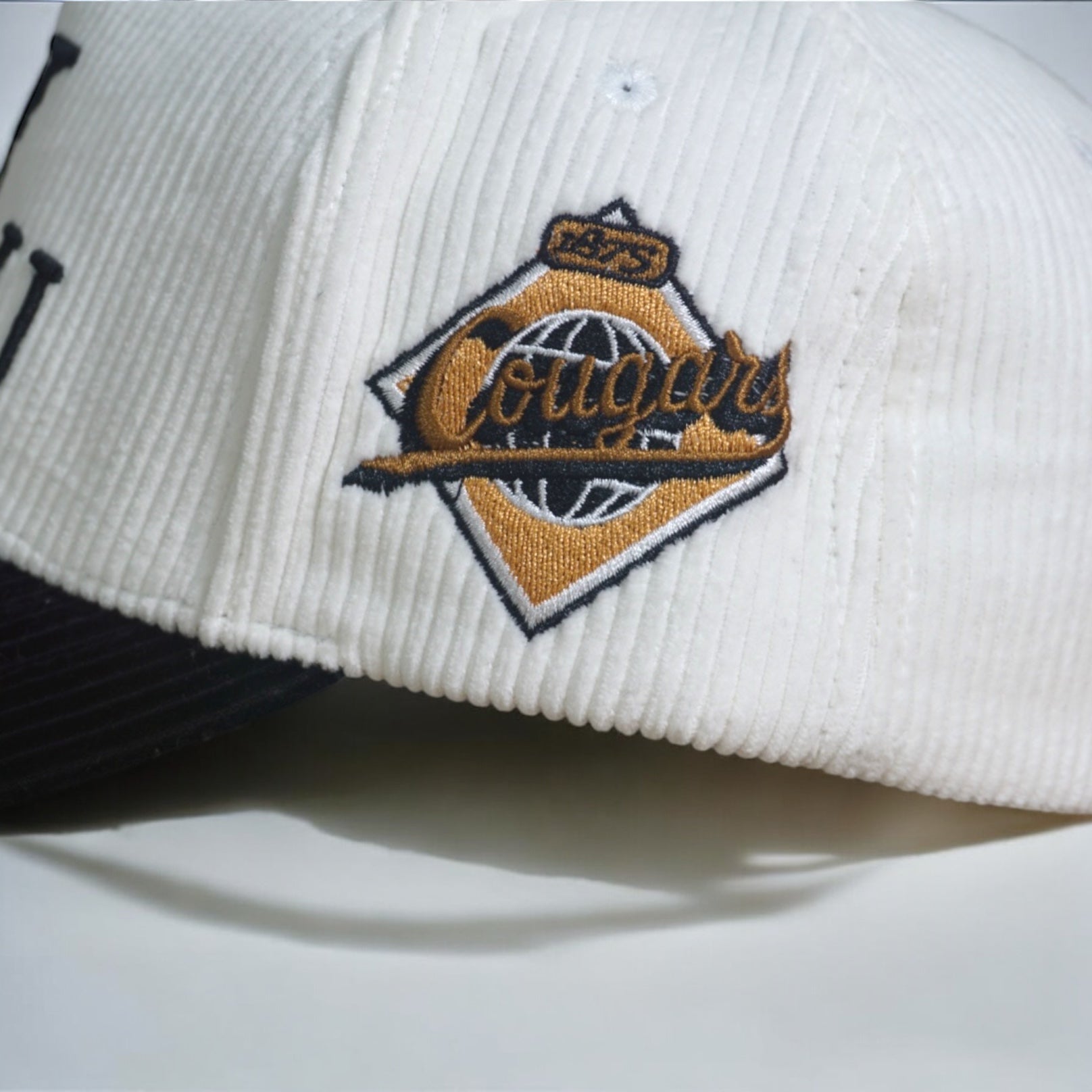 Introducing the BYU Corduroy, a structured 5-panel hat with a deep fit for comfort. Made with full corduroy fabric, it features a stylish black brim and a white crown, combined with a vintage Cougars side logo. Perfect for any fan.